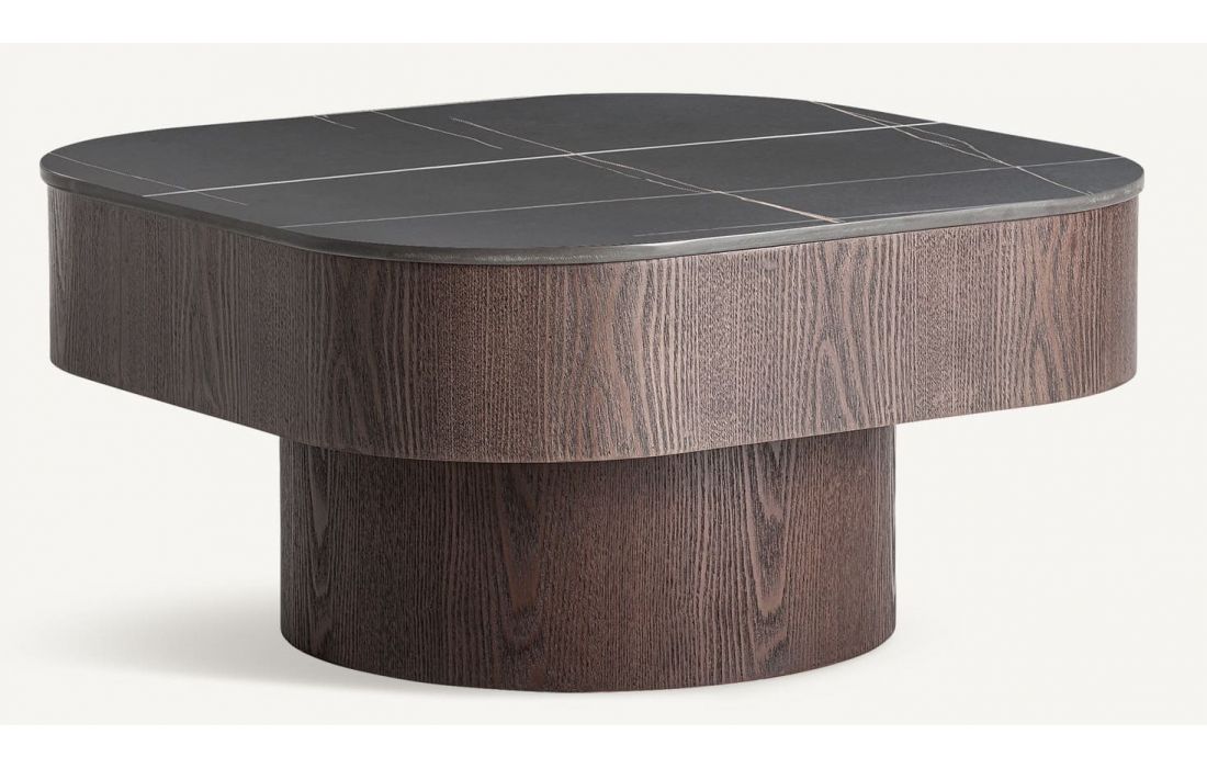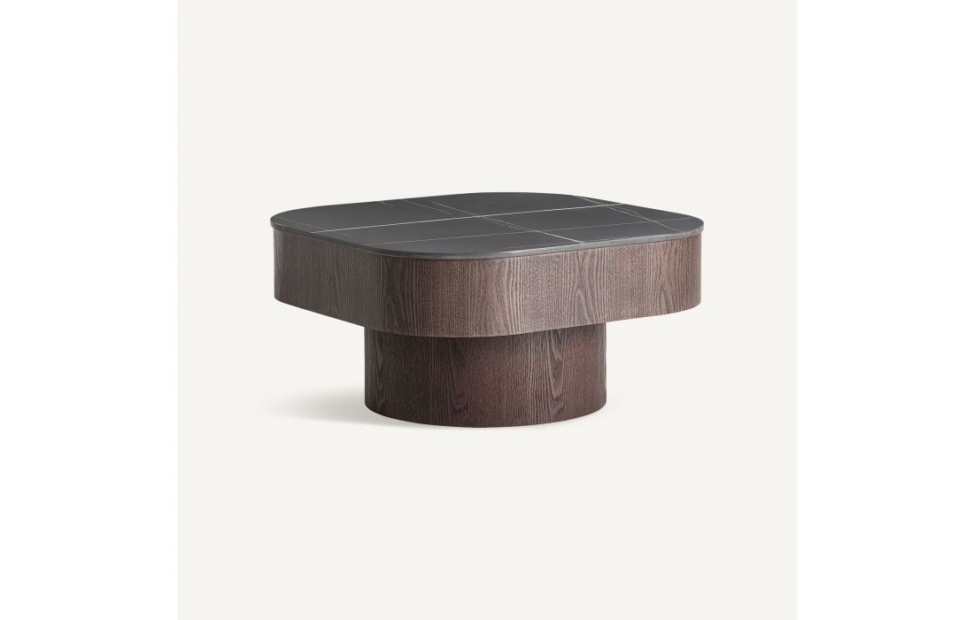 The NEUFS II coffee table, designed for modern spaces, features a synthetic marble casing and a walnut veneer base that adds character, stability, and sophistication.