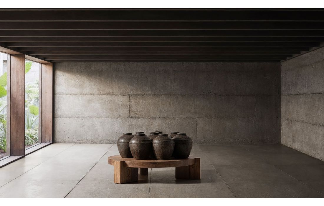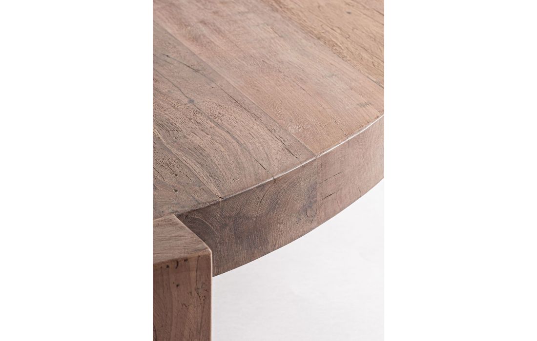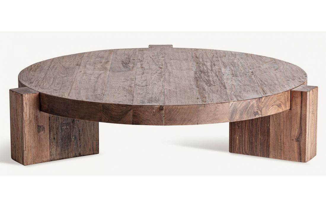 The Brutalist Center Table, made of saltwood, is a compact sculpture with thick legs supporting a solid disc. Resounding and symbolic, it conveys calm and timeless strength.
