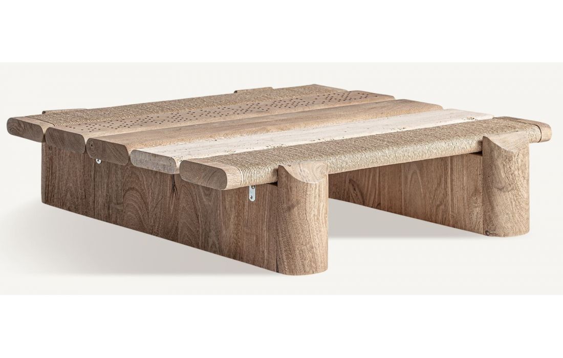 The JACQUARD III CENTER TABLE. Made of mango wood and marble, it stands out for its architectural presence and distinctive character.