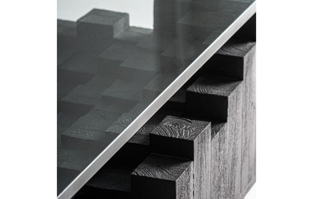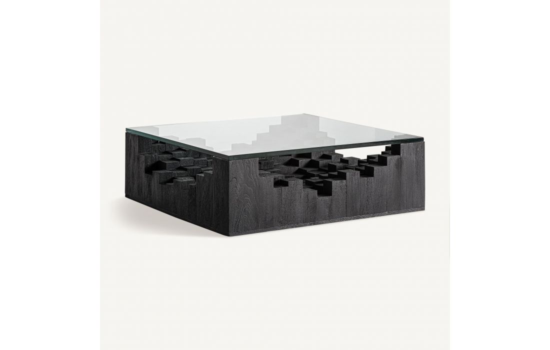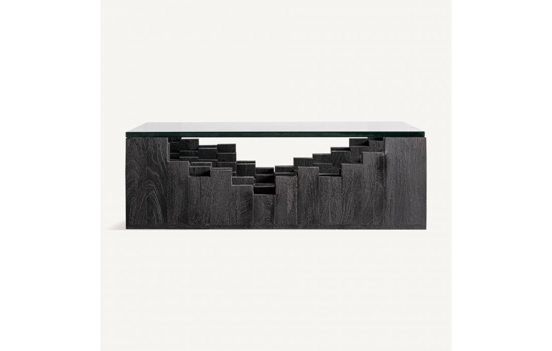 This coffee table establishes a poetic dialogue between mango wood and glass.Its geometric base supports a glass envelope that reveals the interior structure.The contrast between strength and luminous transparency creates balance and contemporary elegance.