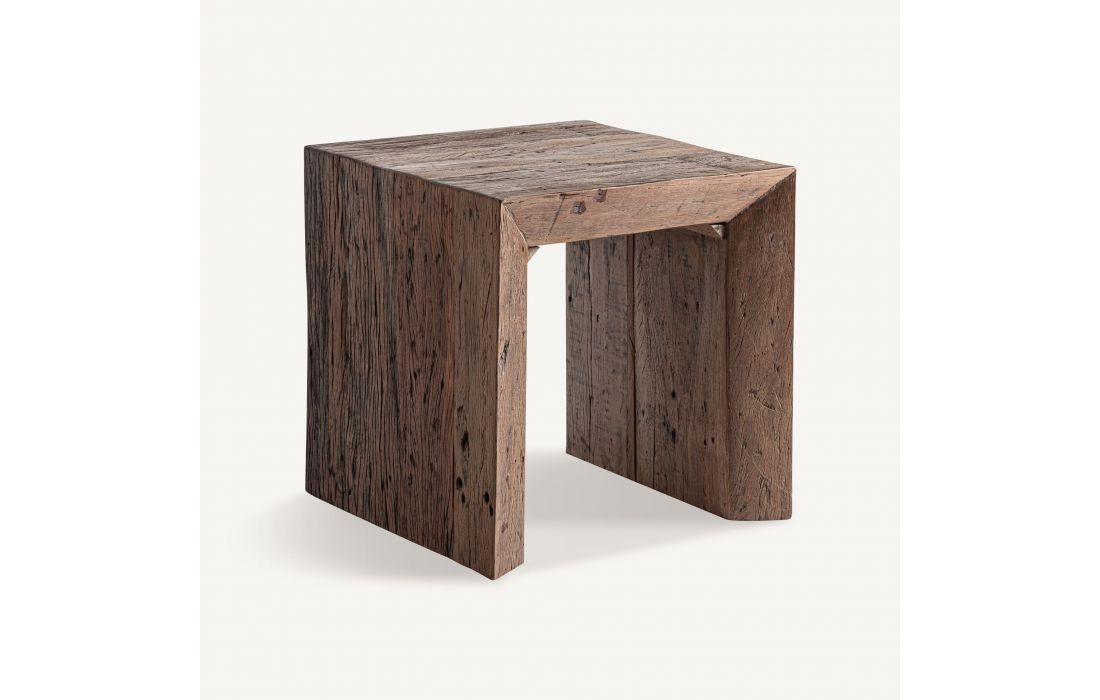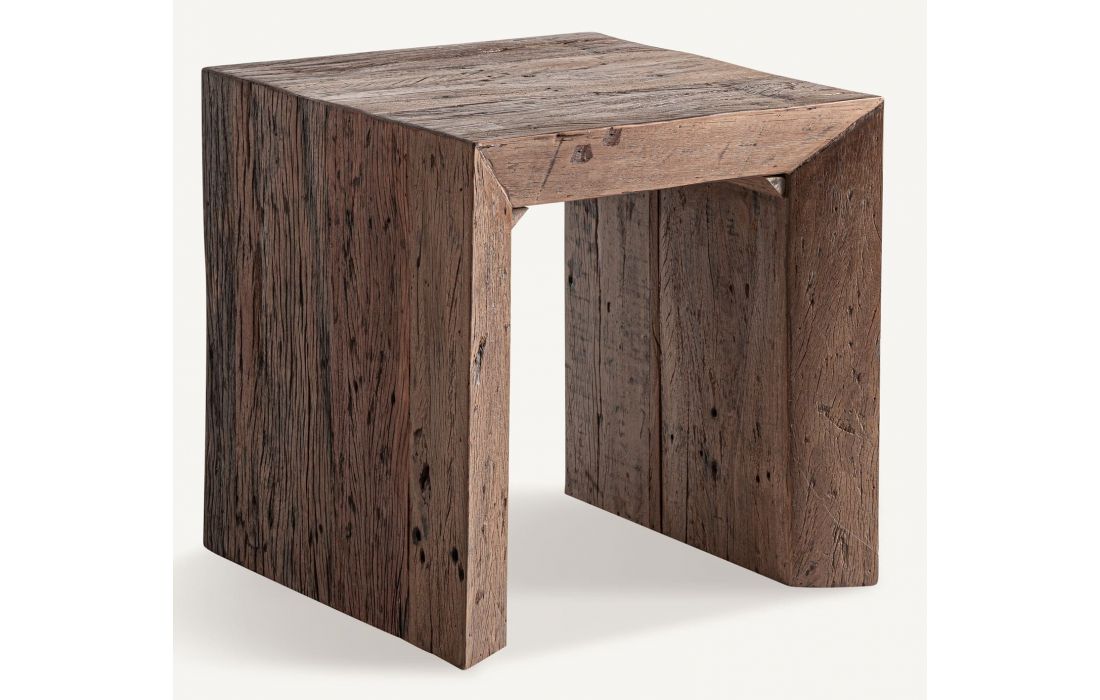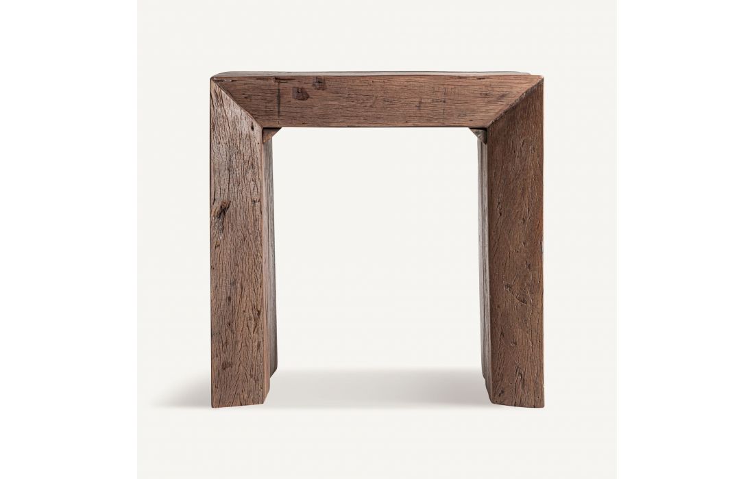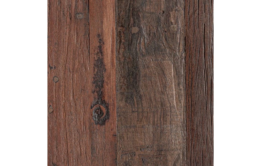 This coffee table expresses the strength of wood in its most authentic state. Made from reclaimed wood with an aged brown finish, its striking design and rustic inspiration bring character and architectural presence.