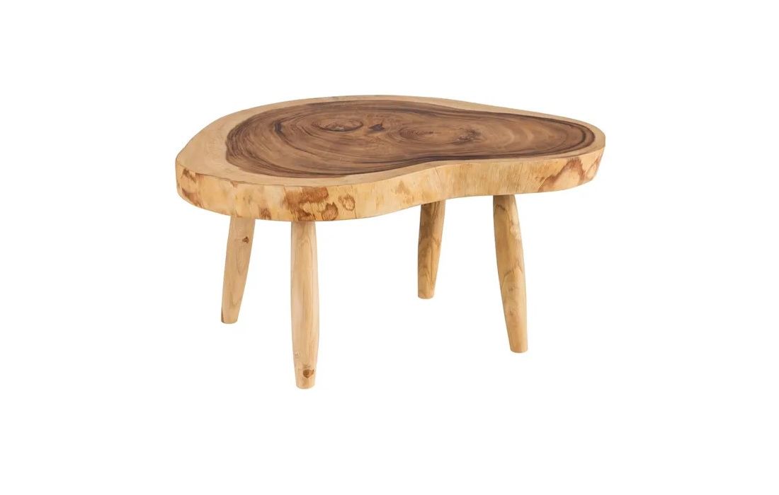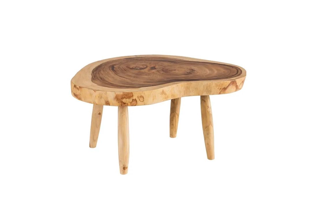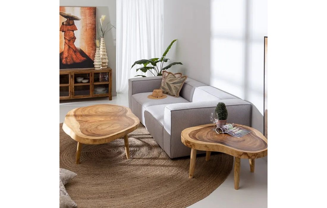 Coffee table made of suar wood, with an organic shape and unique natural grain that enhances the beauty of the piece.It has sturdy legs that ensure stability and a rustic-contemporary design, ideal for adding prominence and elegance to the living room.
