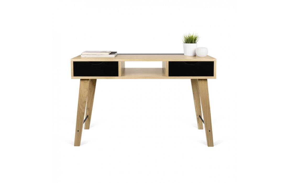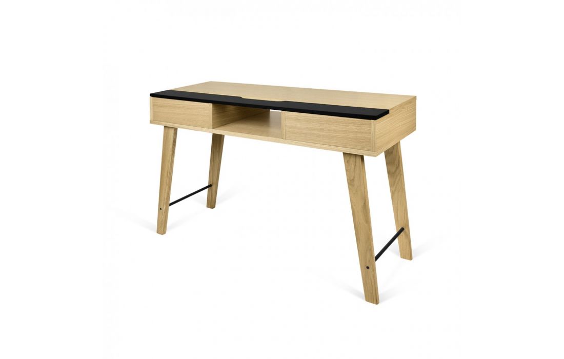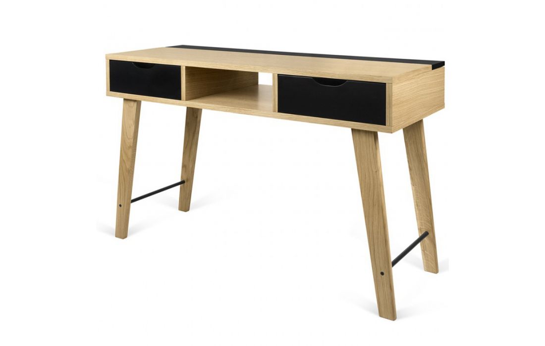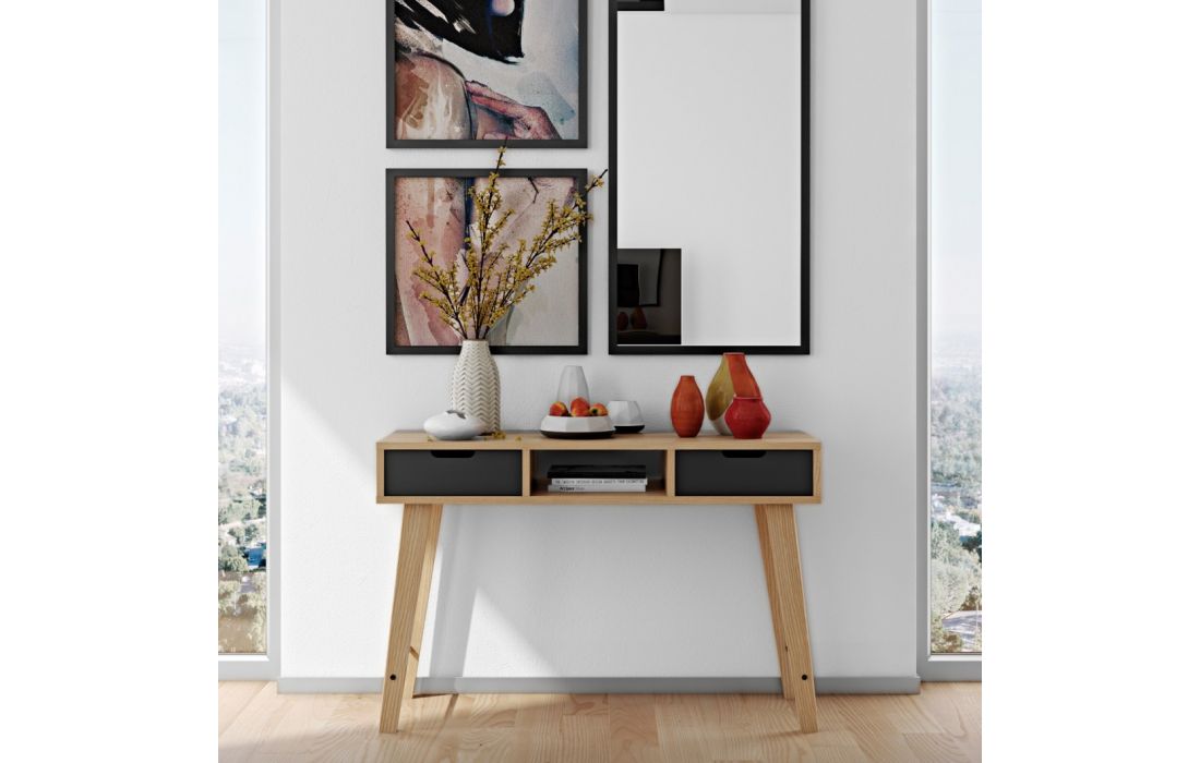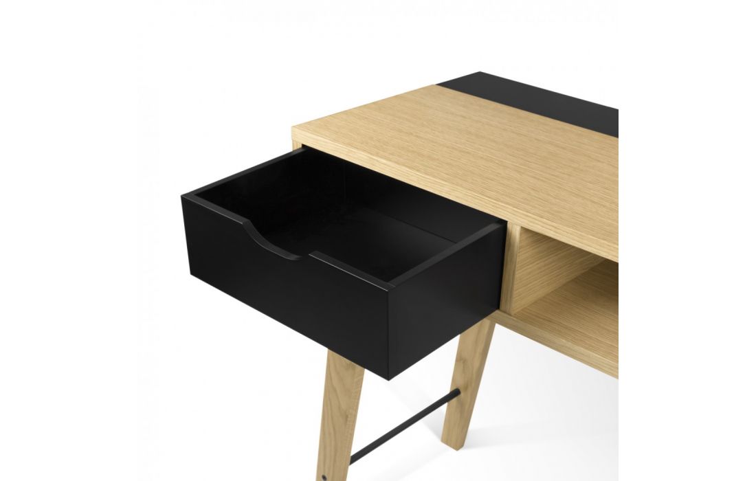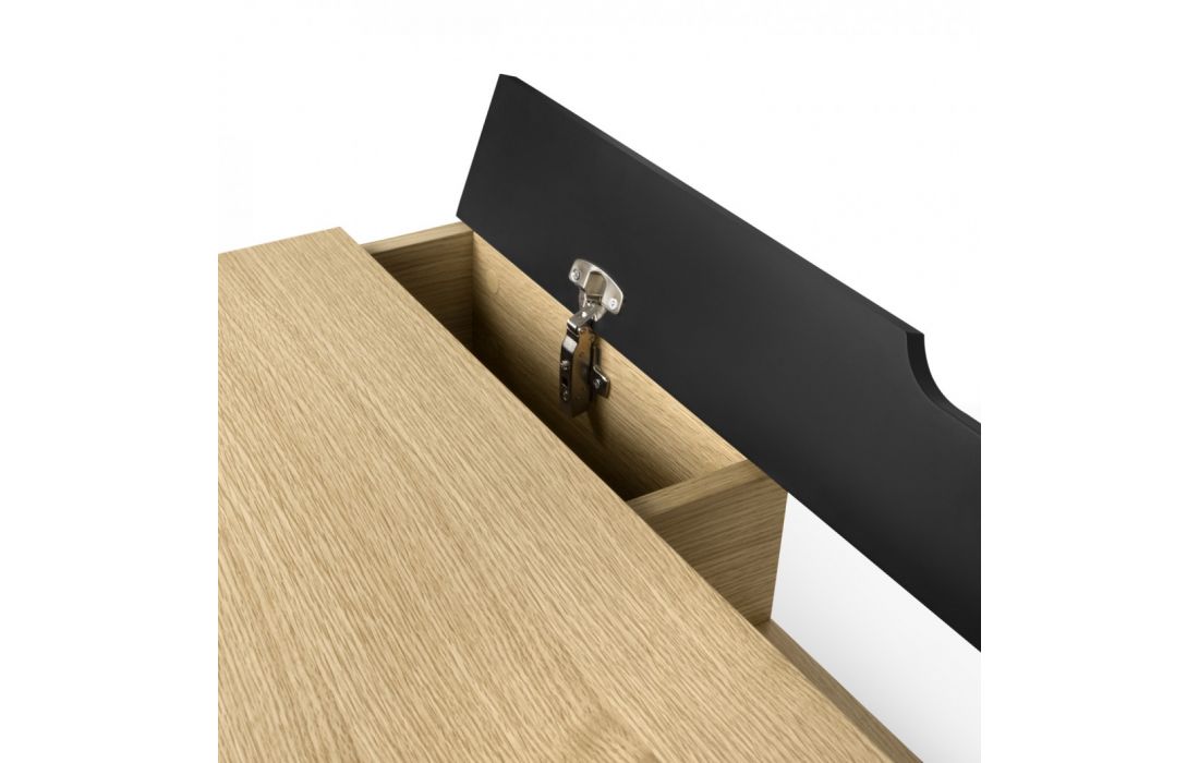 Console with one open central storage compartment, two black drawers and a narrow lift top that gives access to discrete areas of complementary organization.
