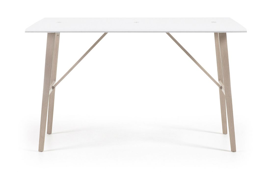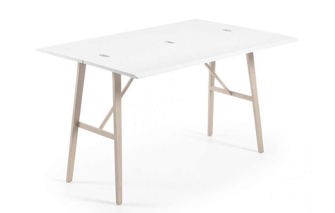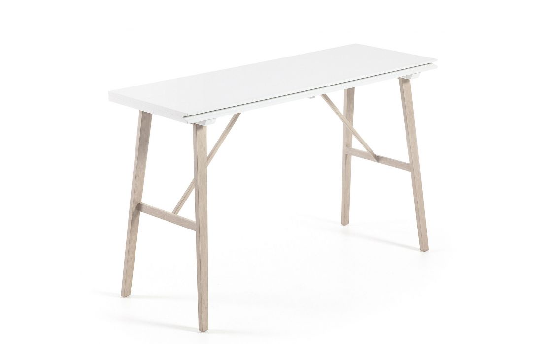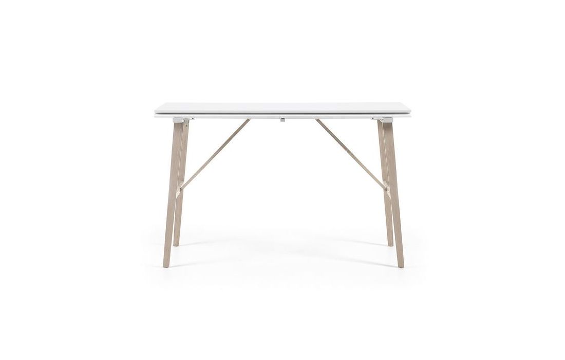 Convertible console in white color table with MDF top and steel feet with wooden appearance.