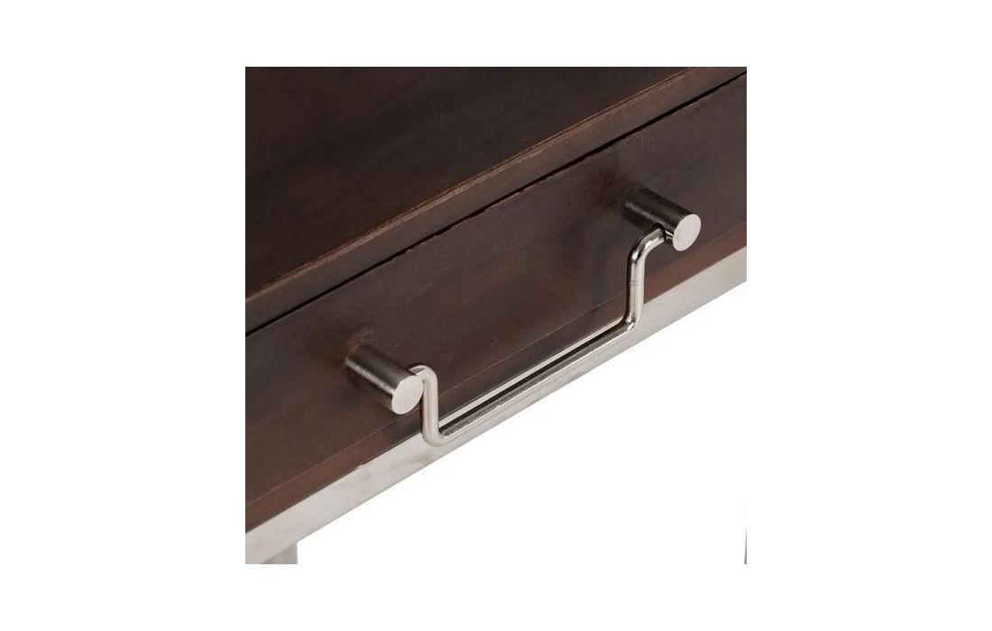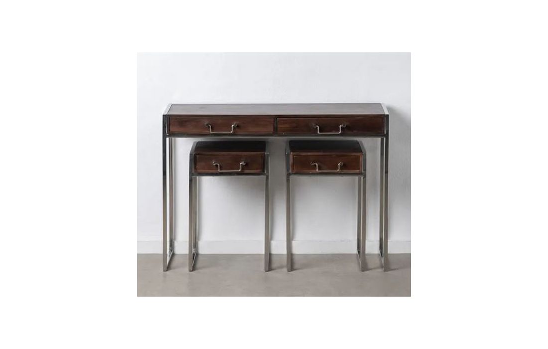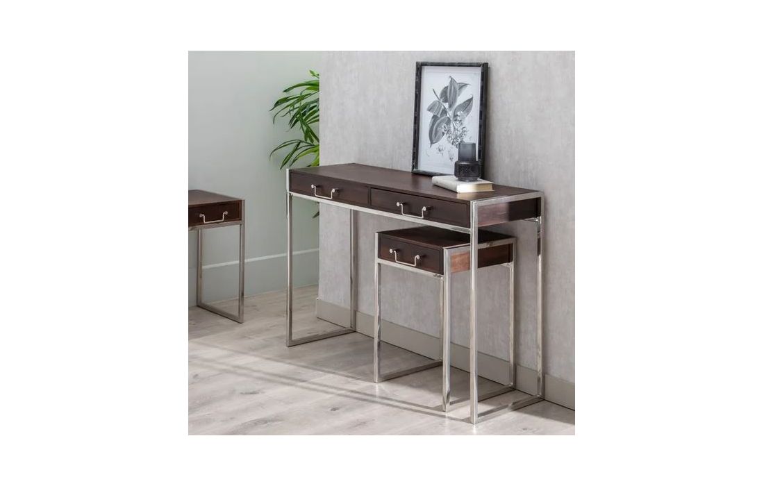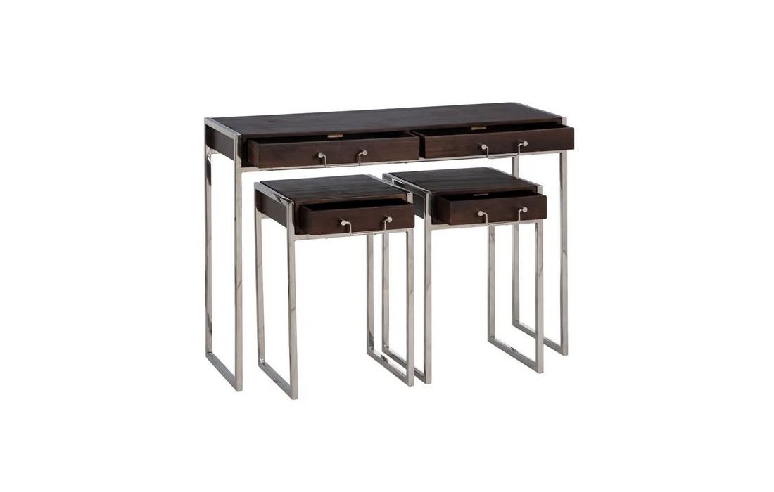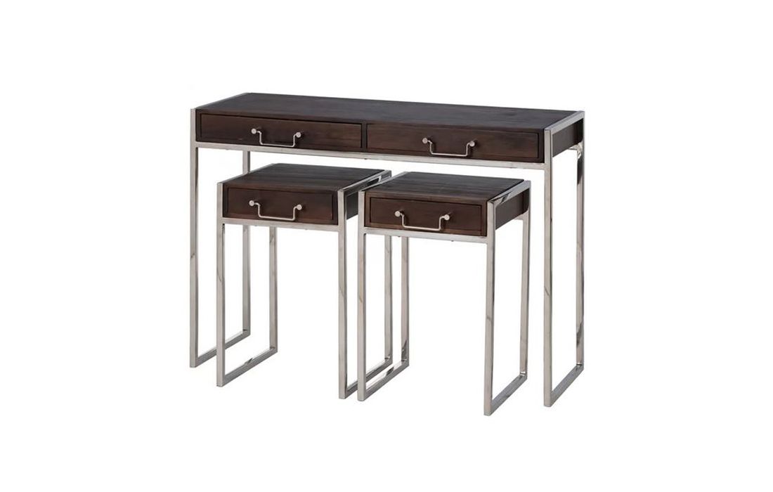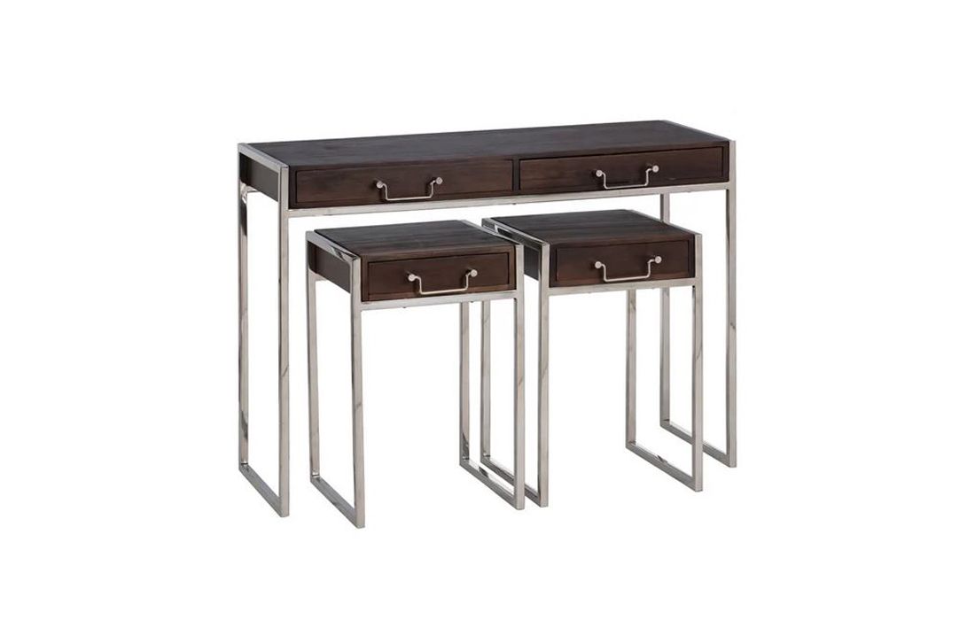 Console set and 2 side tables with silver metal structure and acacia wood top