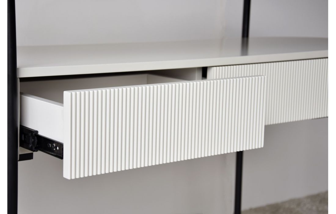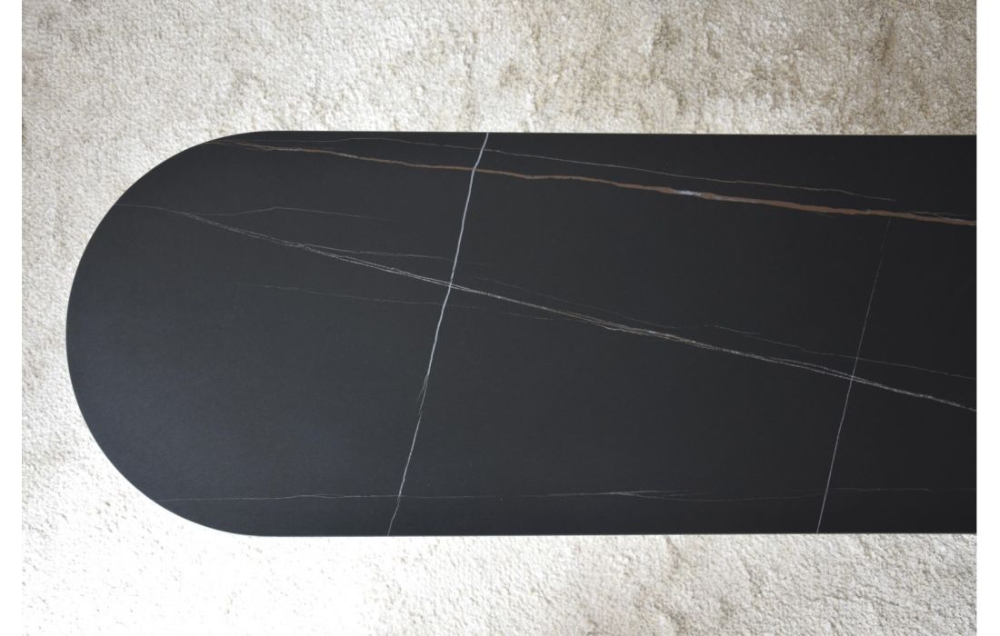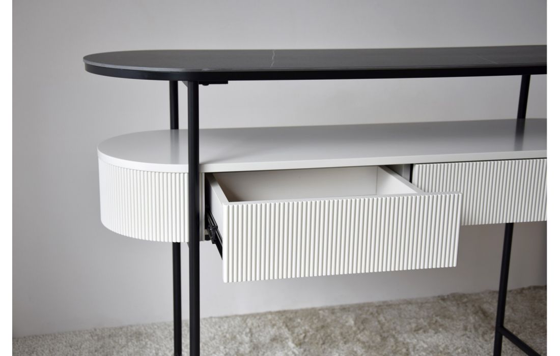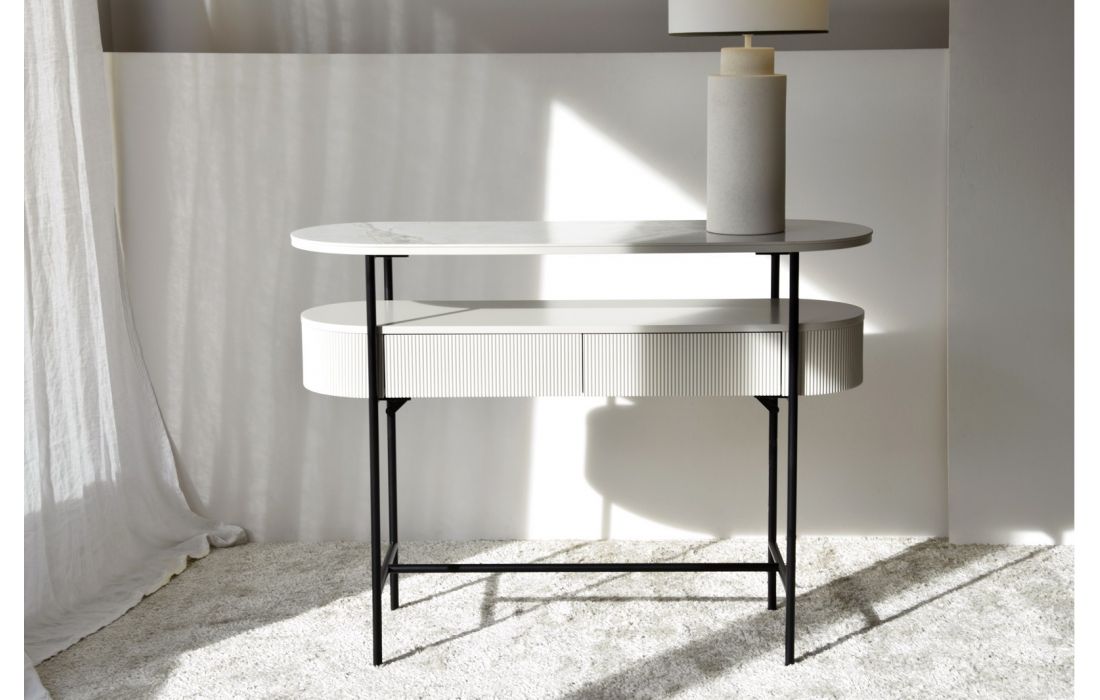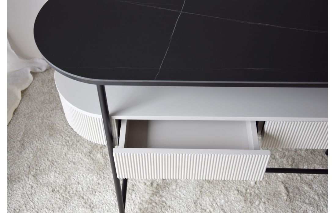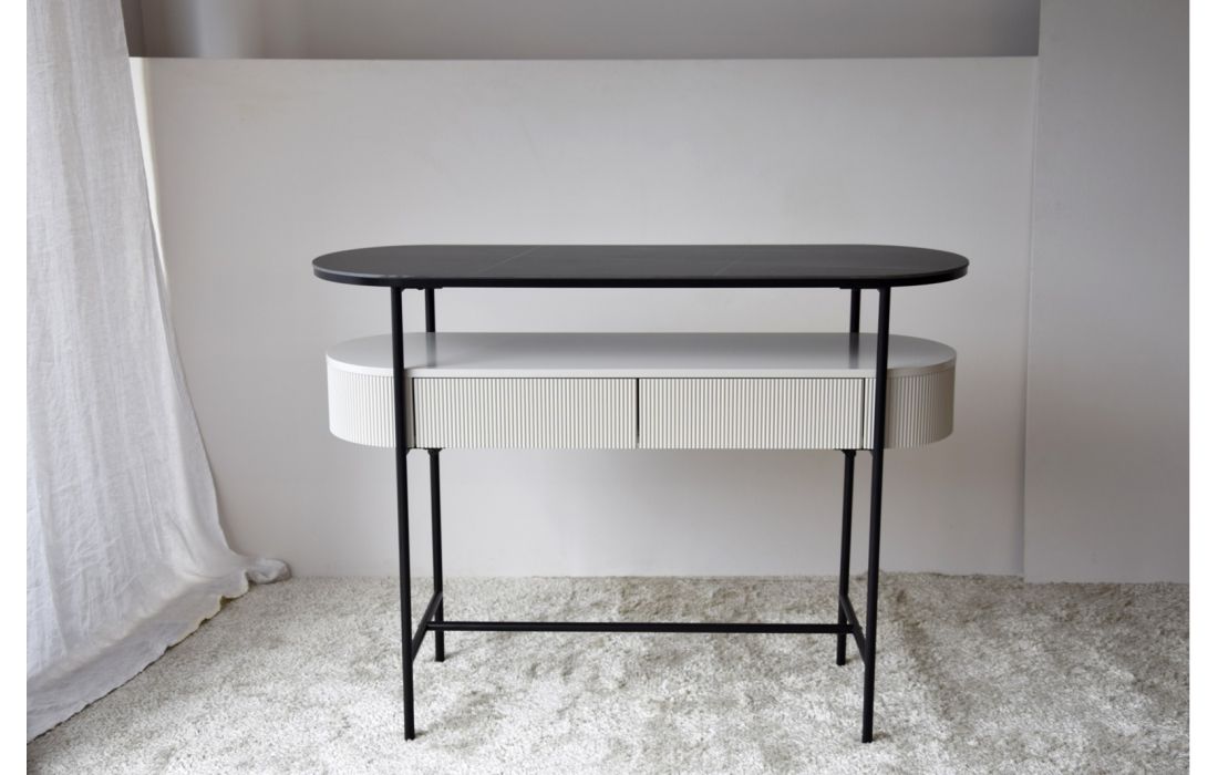 Console for hall with ceramic and stone top, wood at the bottom. Metal feet with 2 drawers.
