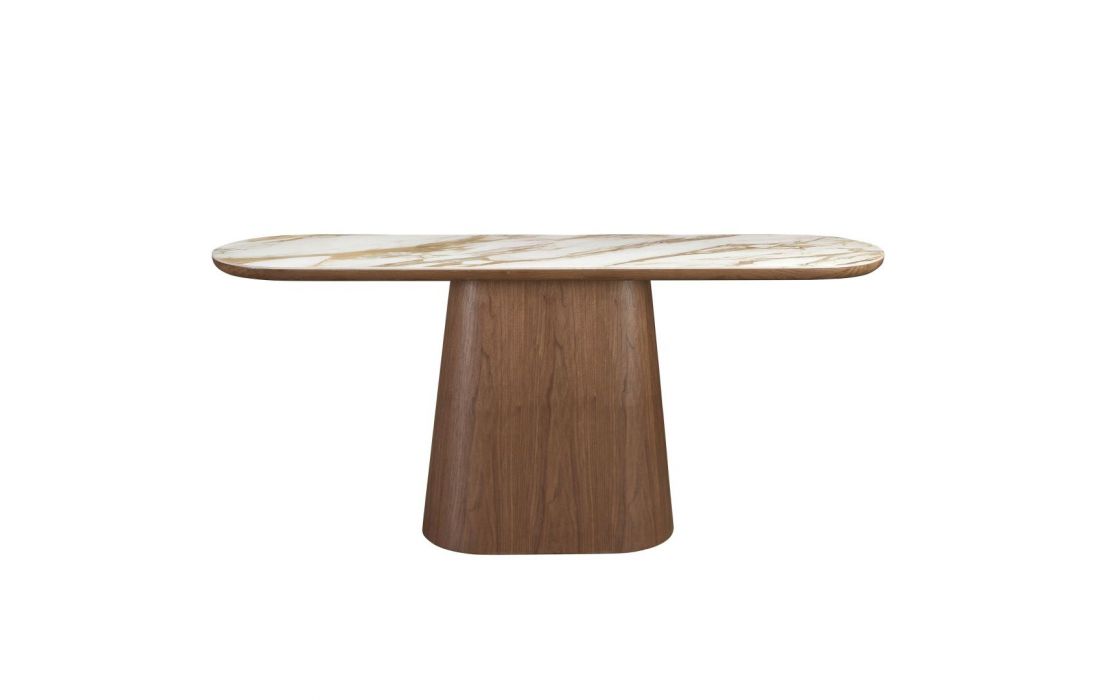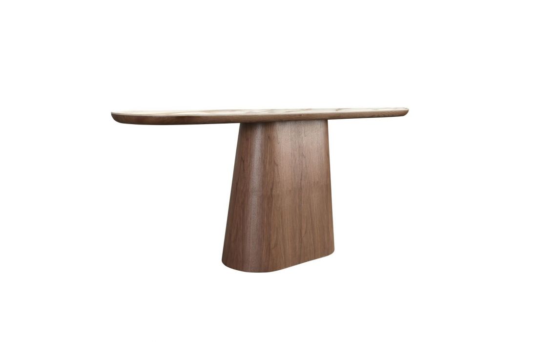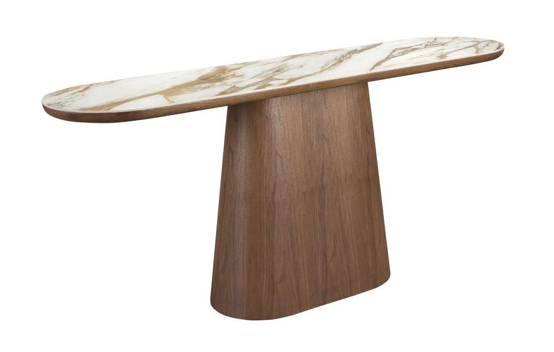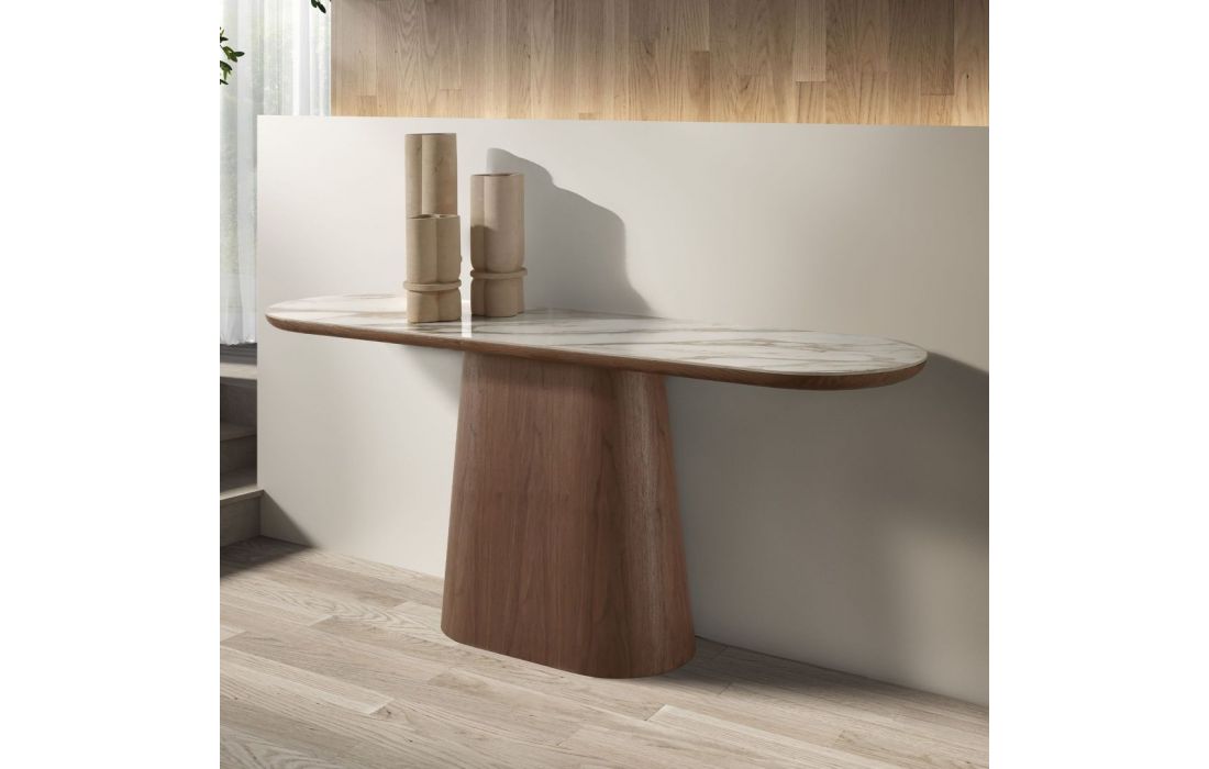 Modern oval console with a glossy finish, marble top and original walnut veneer legsRecipient :