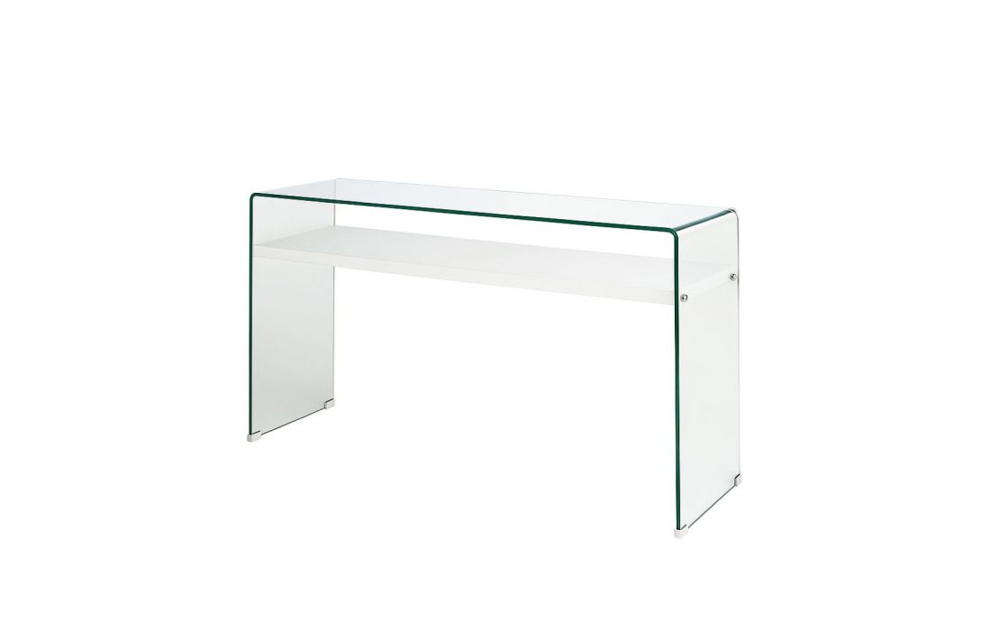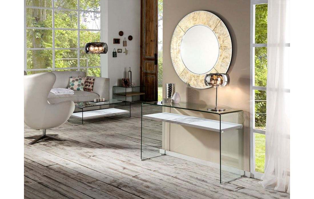 Console made of 12mm curved tempered glass with MDF shelf, white marble imitation finishRecipient :