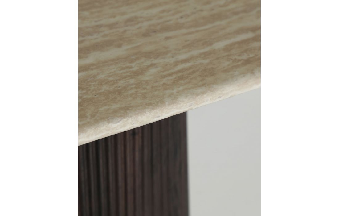 This console combines a dark-toned MDF frame with an elegant synthetic marble top, achieving a sophisticated and balanced design.Its clean lines and refined finishes make it a versatile and functional piece.