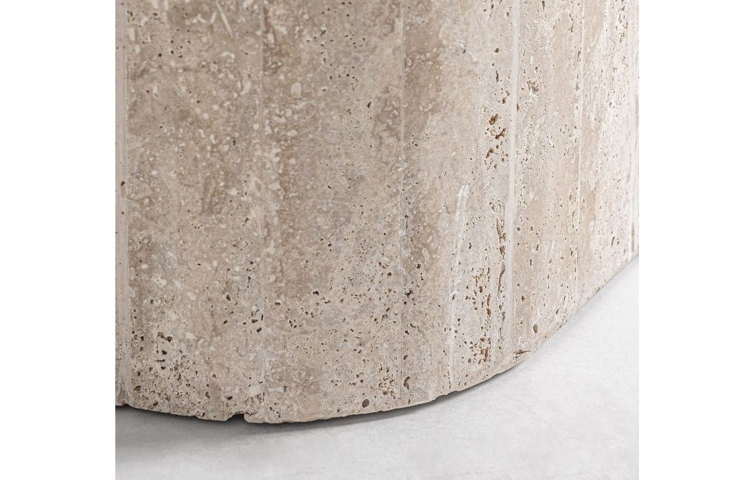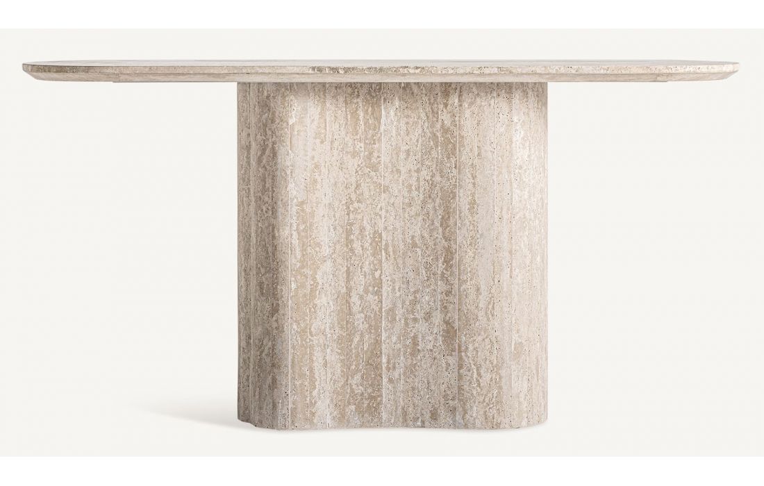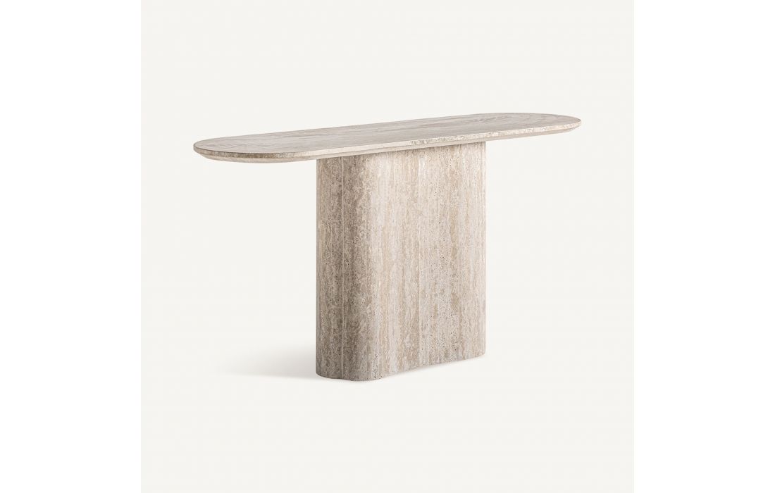 This console, crafted from beige travertine and featuring an Art Deco design, offers a sculptural presence and sophistication to any space.