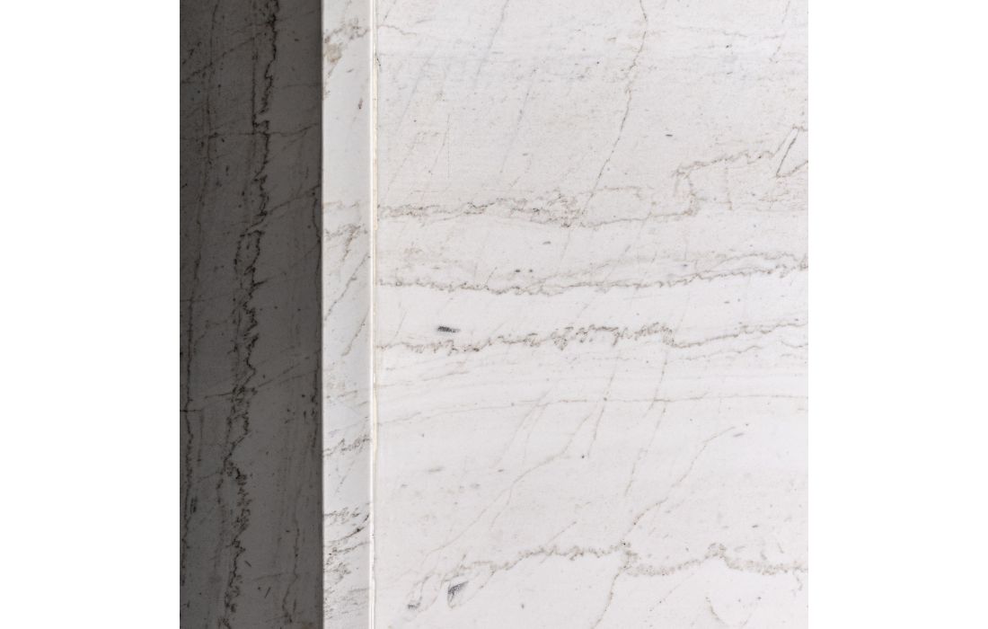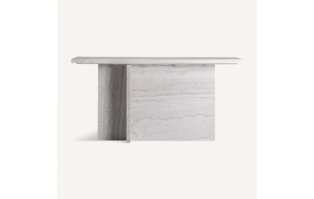 Crafted from broken white marble, this console, with its minimalist and architectural design ideal for spaces seeking purity and sophistication, offers a sculptural presence and sophistication to any space.