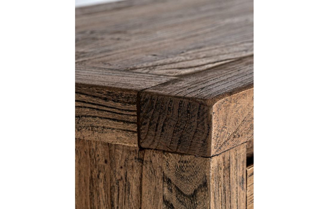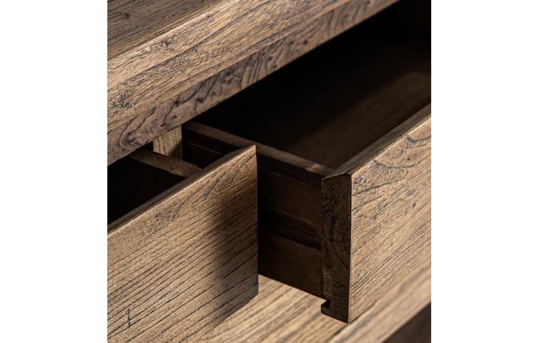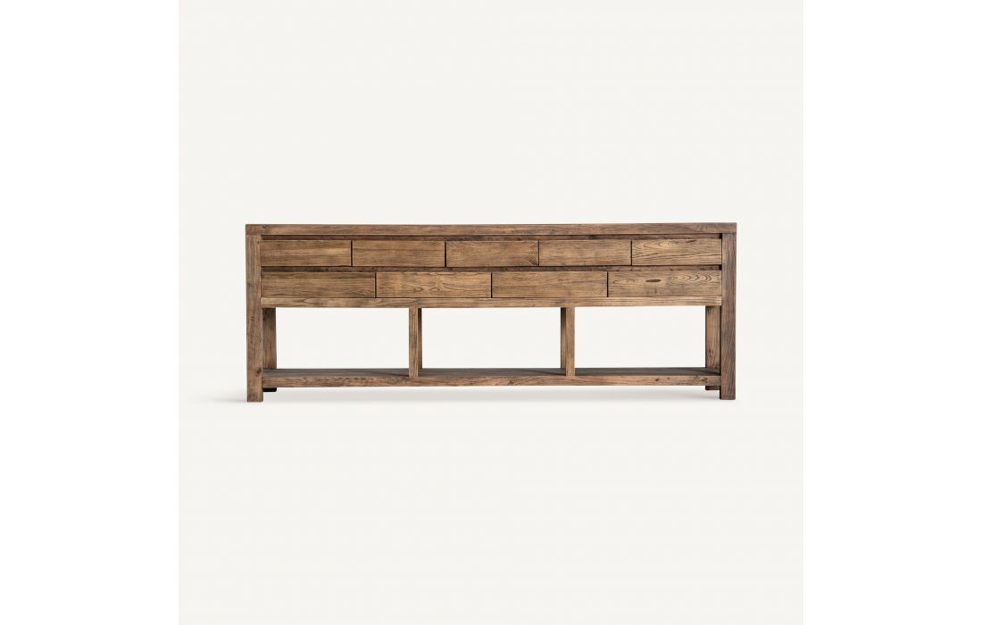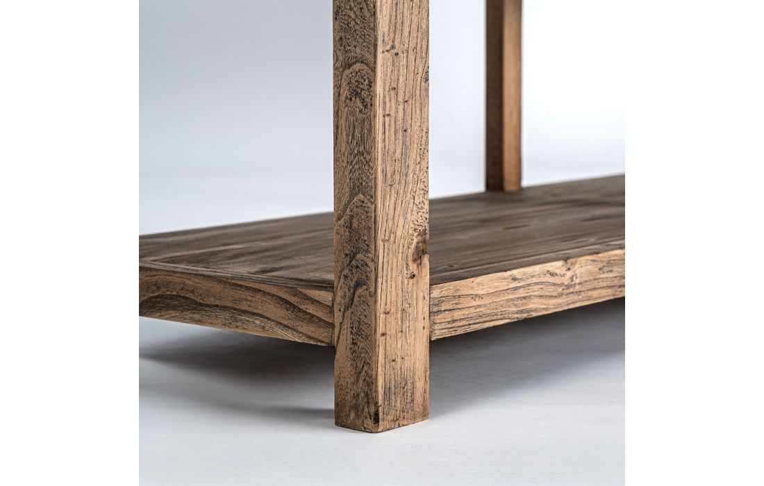 This console combines brown elm wood and a black iron frame. A contemporary design that provides functionality with character.