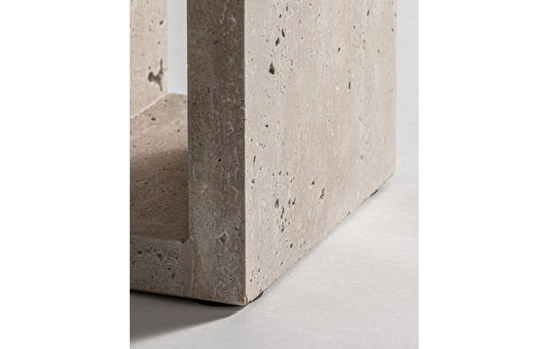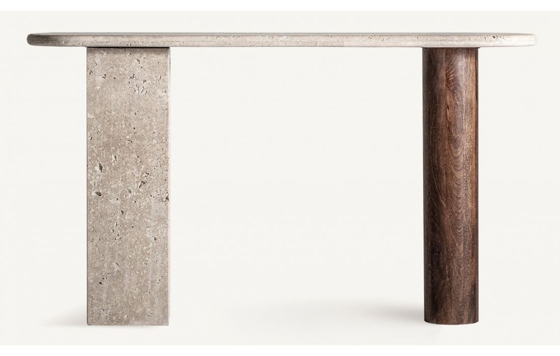 This console combines the character of travertine with the elegance of mango wood in a design with art deco nods.A sculptural and versatile piece, ideal for adding presence and sophistication to entryways.