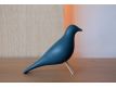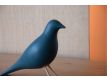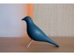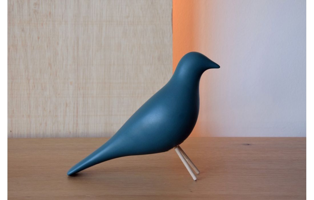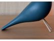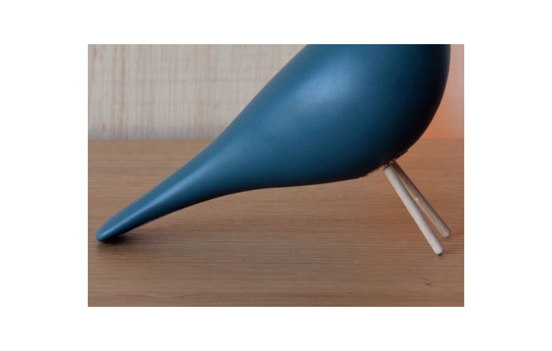 Decorative piece in a bird figure made of ceramic with a matte blue finish and wooden legs.