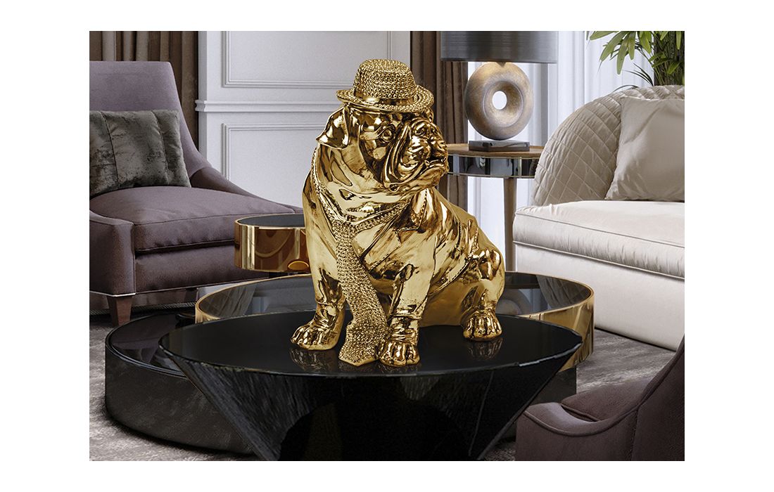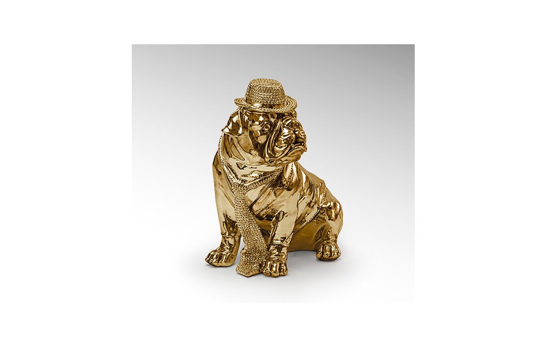 Dog figure with hat and tie, bull dog breed. Made of polyresin, finished in gold electrolytic bath