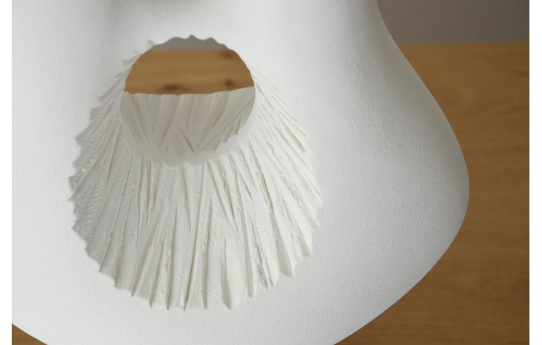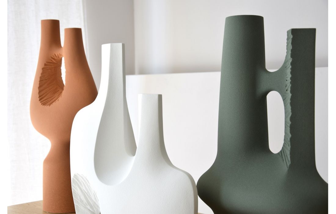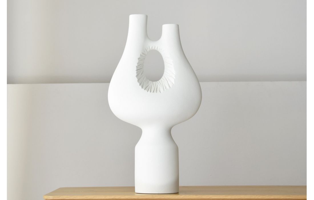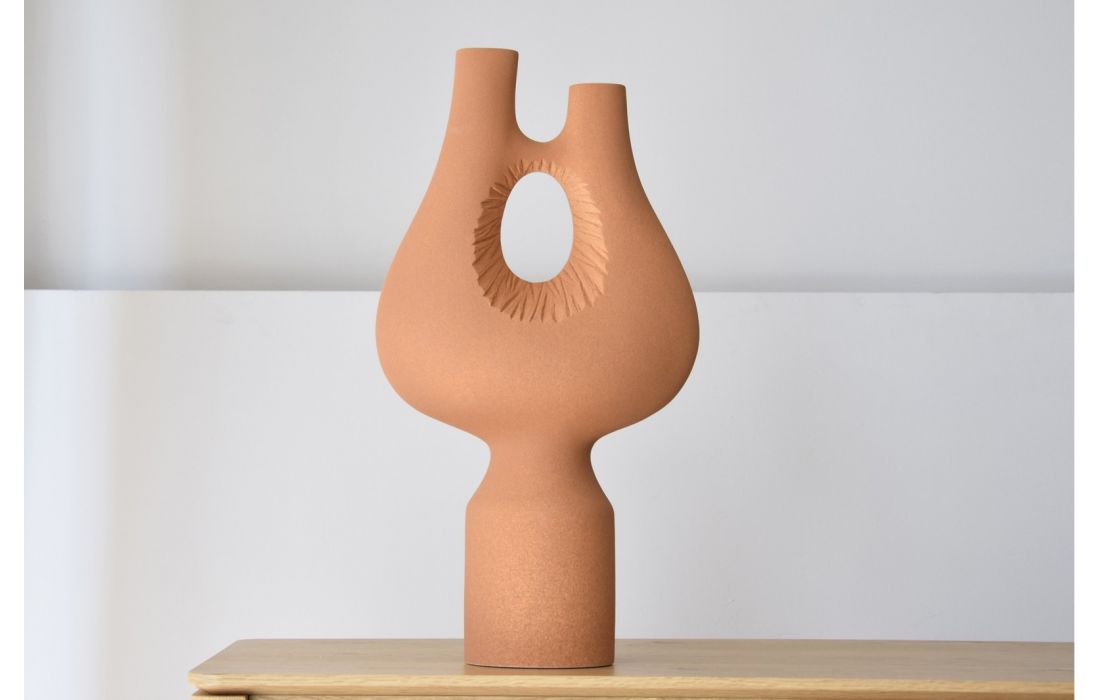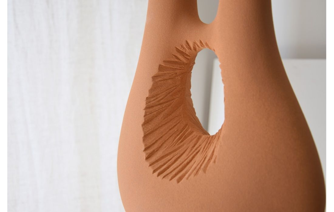 Sculpture made in ceramic with white or orange finish, and texture. Piece cooked at high temperature which makes each one unique.