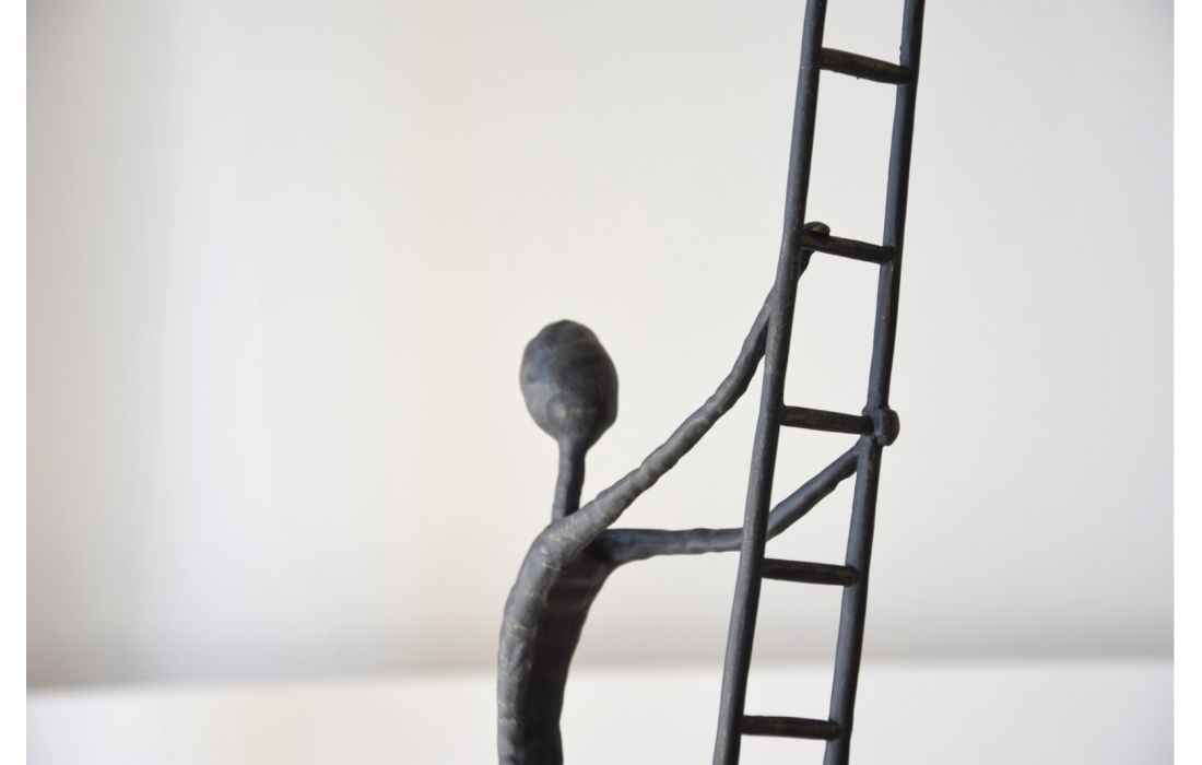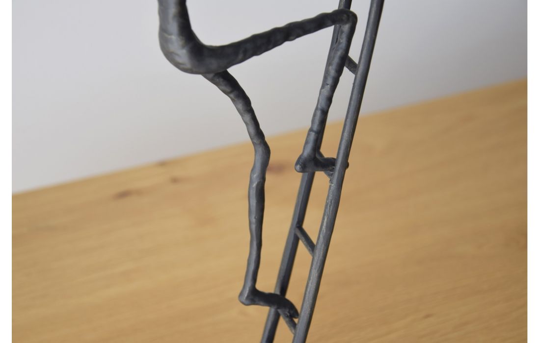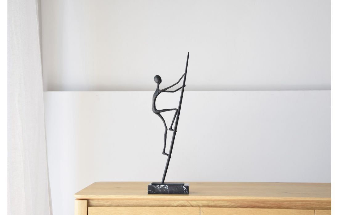 Sculpture of a figure climbing a metal ladder with an aged bronze finish. Black marble base with white veins.