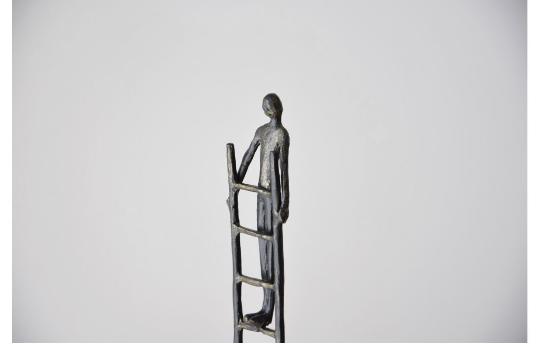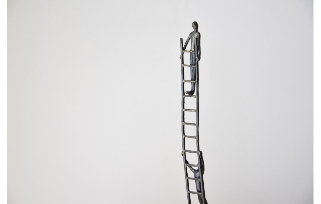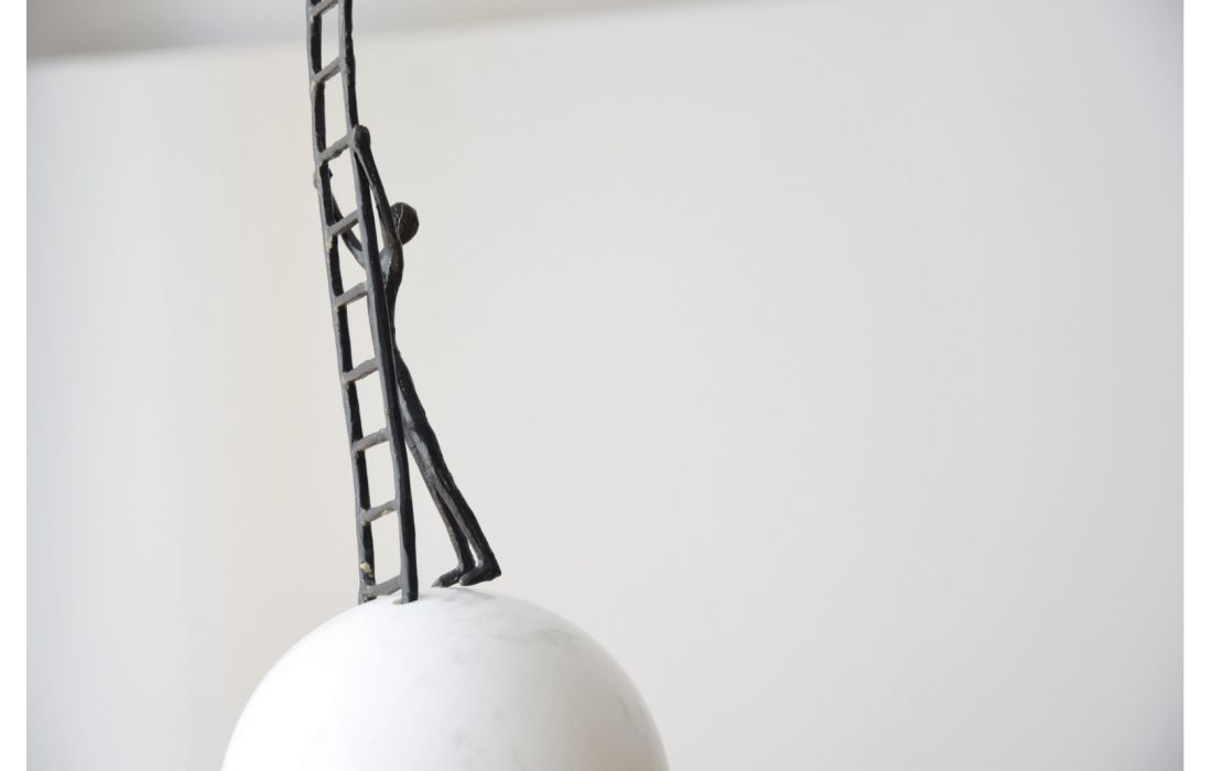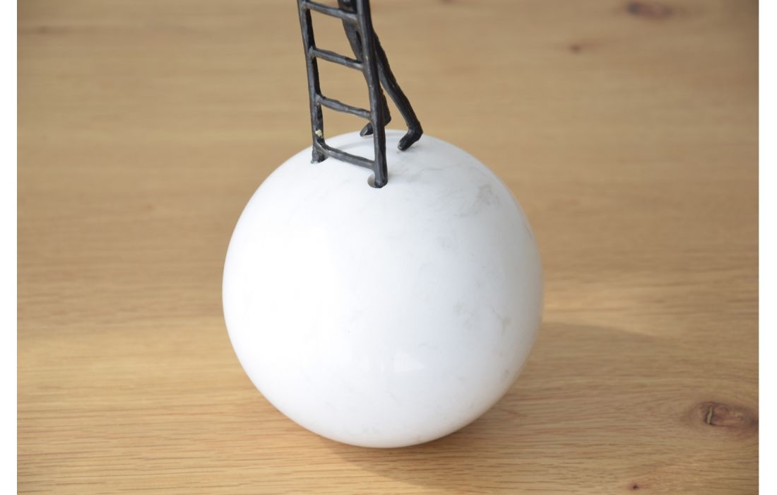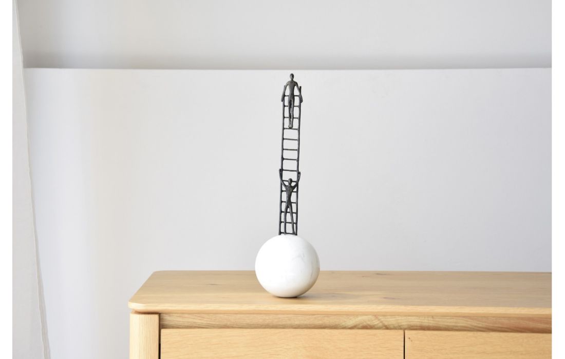 Sculpture representing a staircase with two figures ascending or descending, in metal with an aged bronze finish on a white marble sphere base with gray veins.