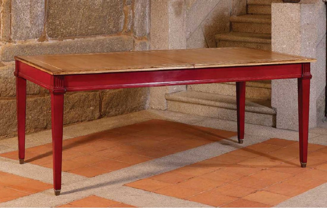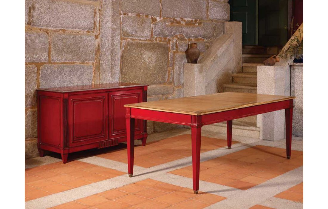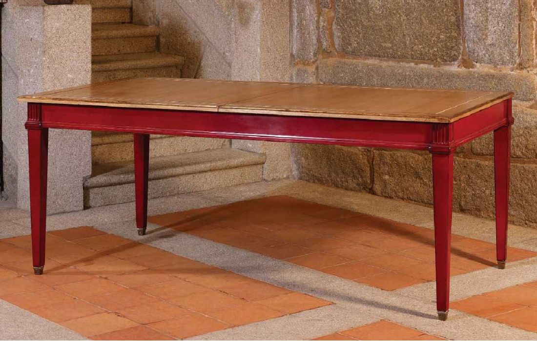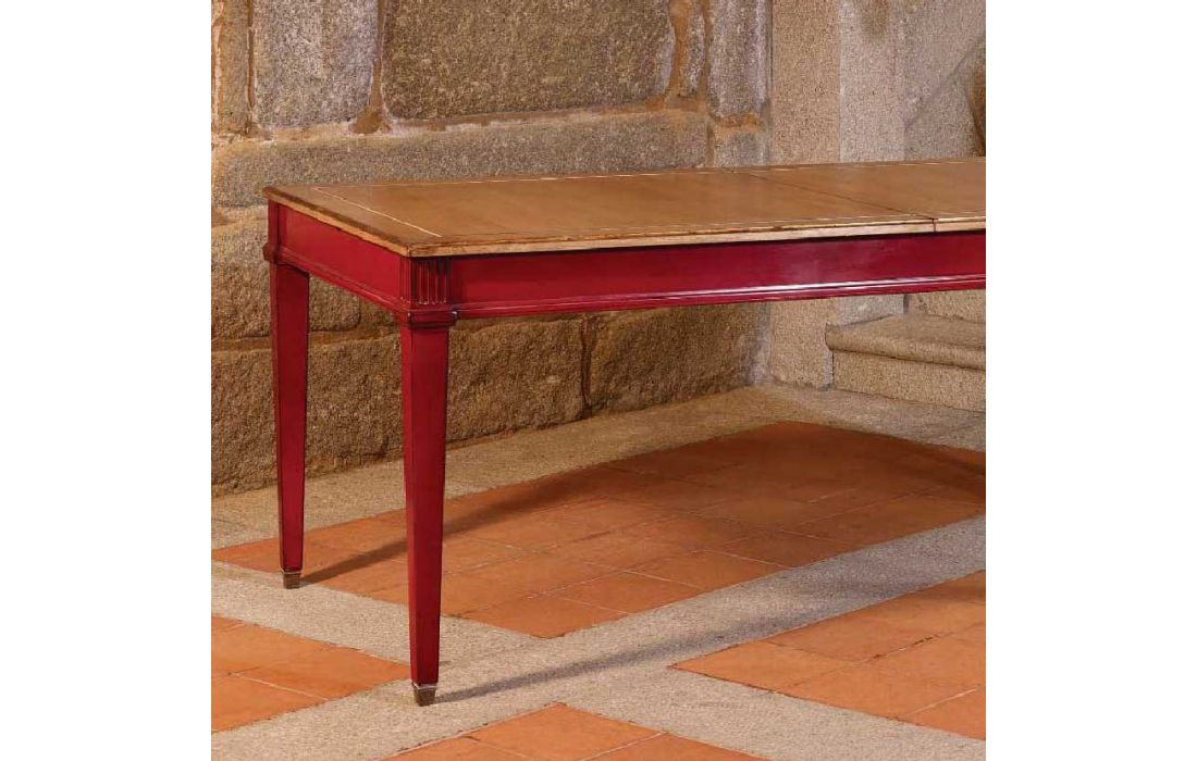 Extensible rectangular table with two extensions of 36.5 cm, Provencal design and detail in gold leaf, with the possibility of several finishes.