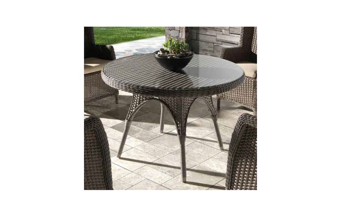 Round table in rattan with glass top, for outdoor use.