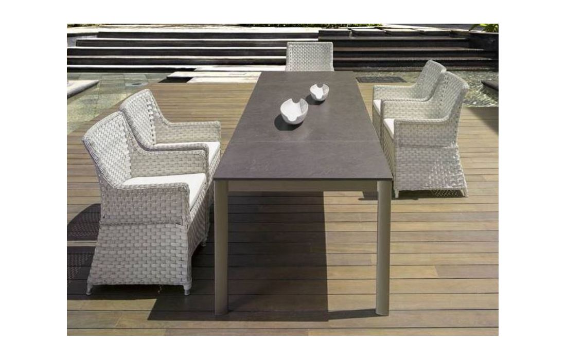 Extensible table in marone aluminum with top in Puroplan moca, for outside use.