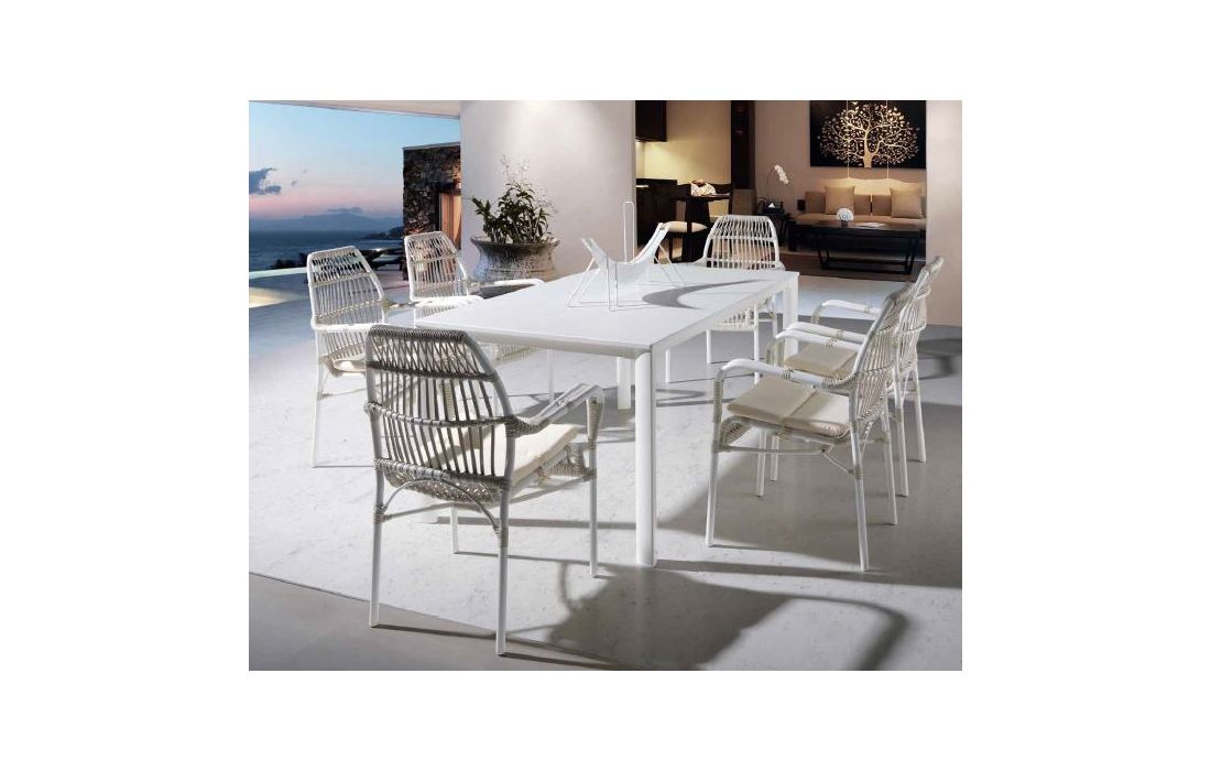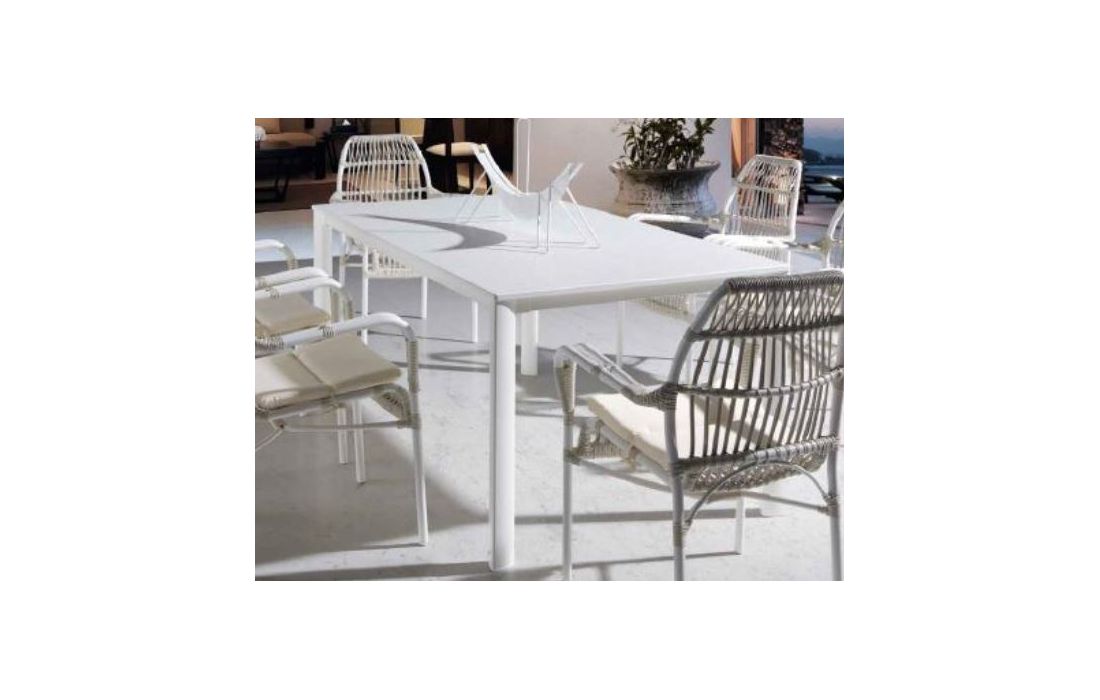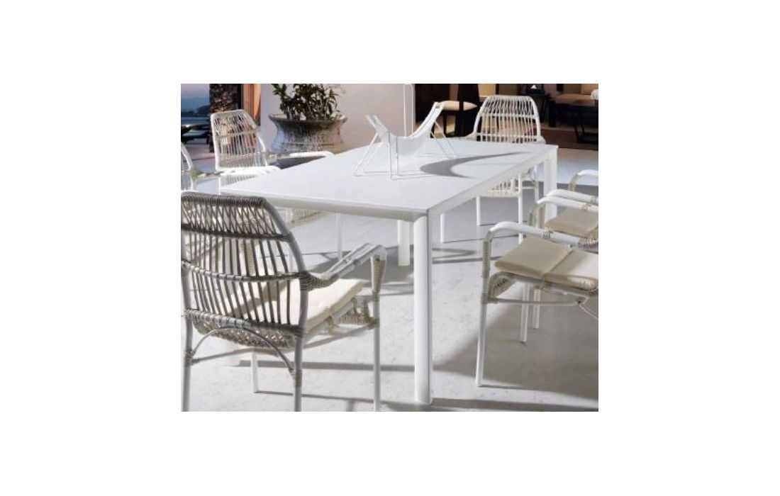 Table in white aluminum with white marble top, for outdoor use.