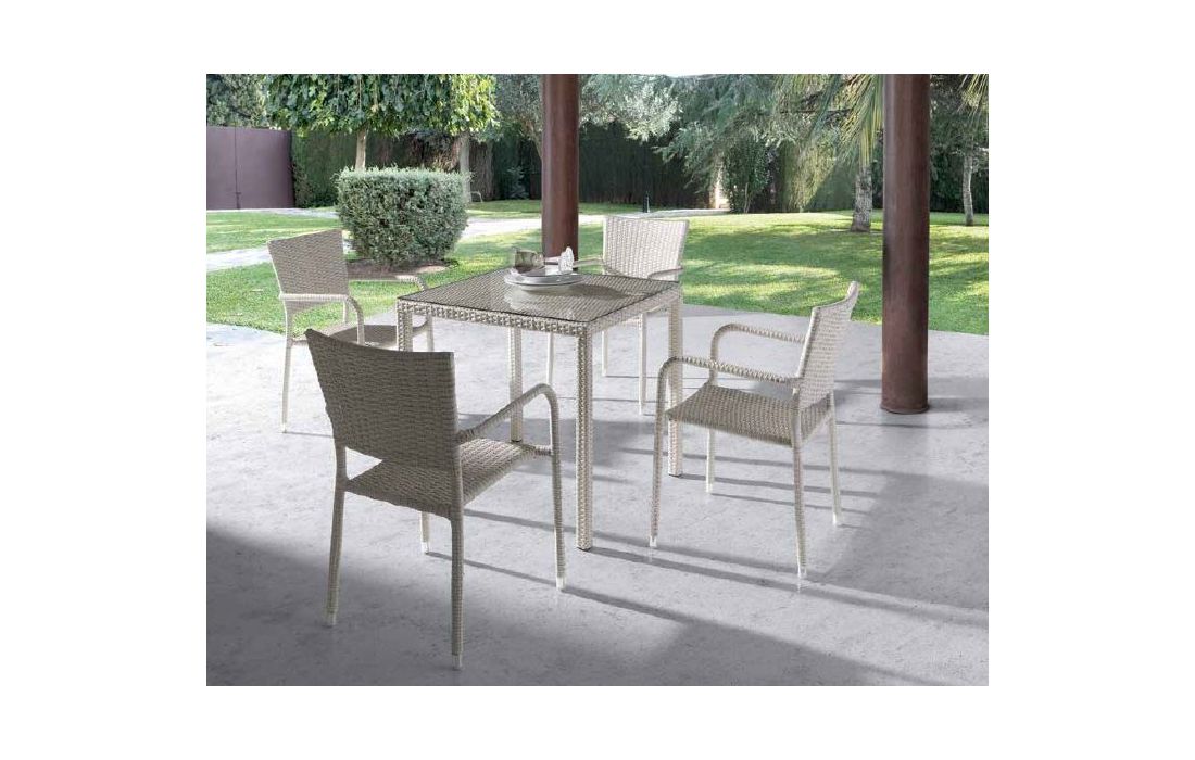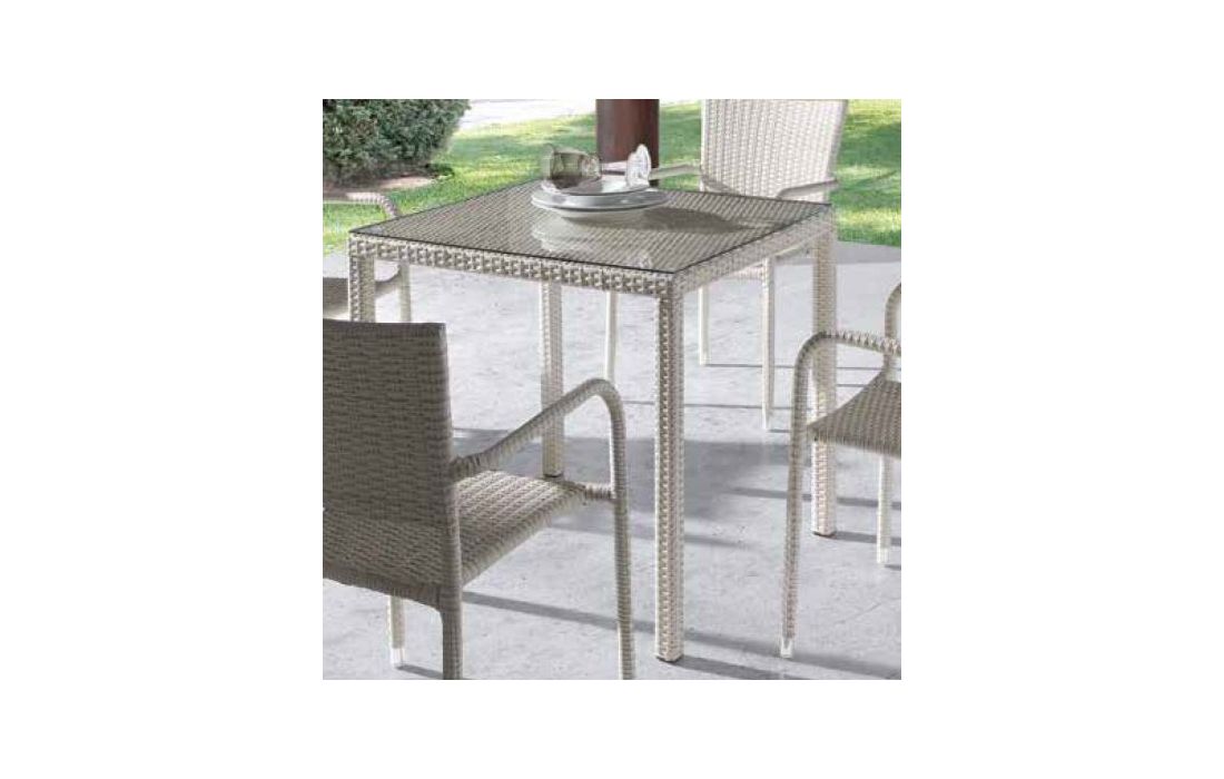 Table in rattan with glass top, for outdoor use.