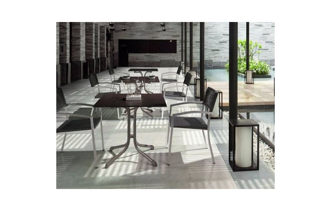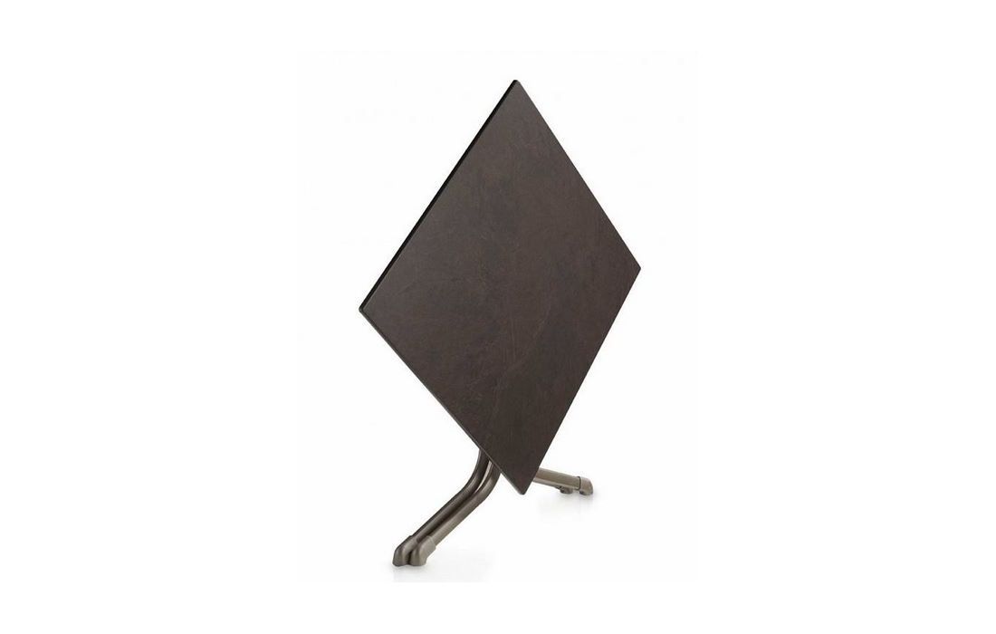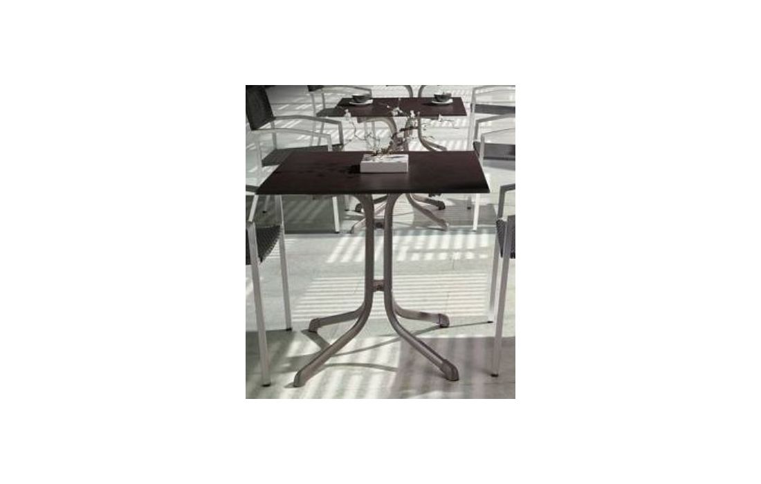 Table in stainless steel with top in moca Puroplan, for outdoor use.