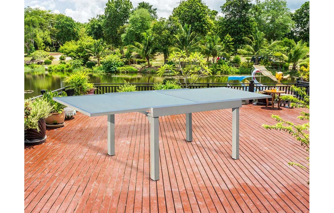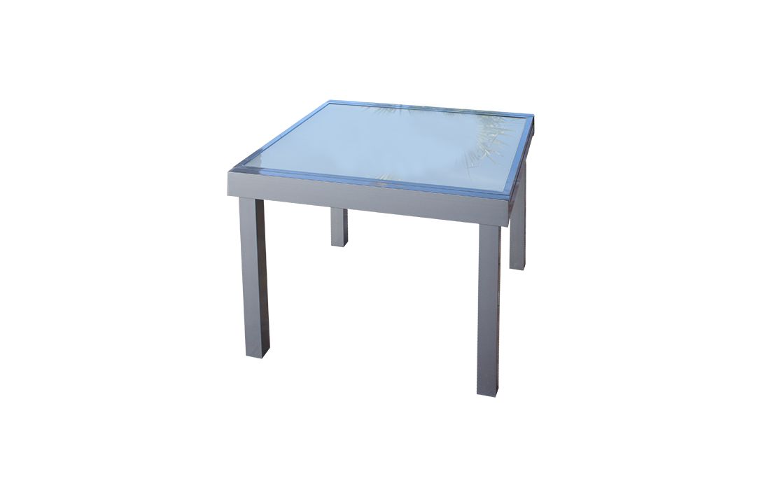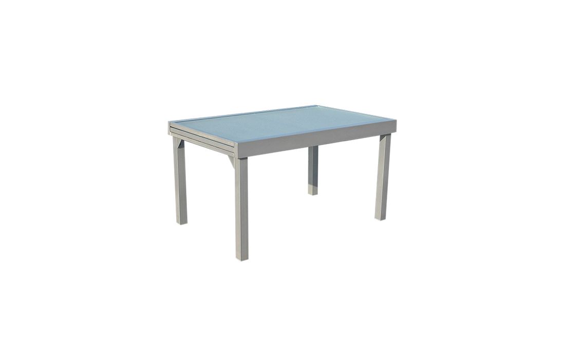 Extending table with structure in silver gray aluminum and translucent, square or rectangular glass top.
