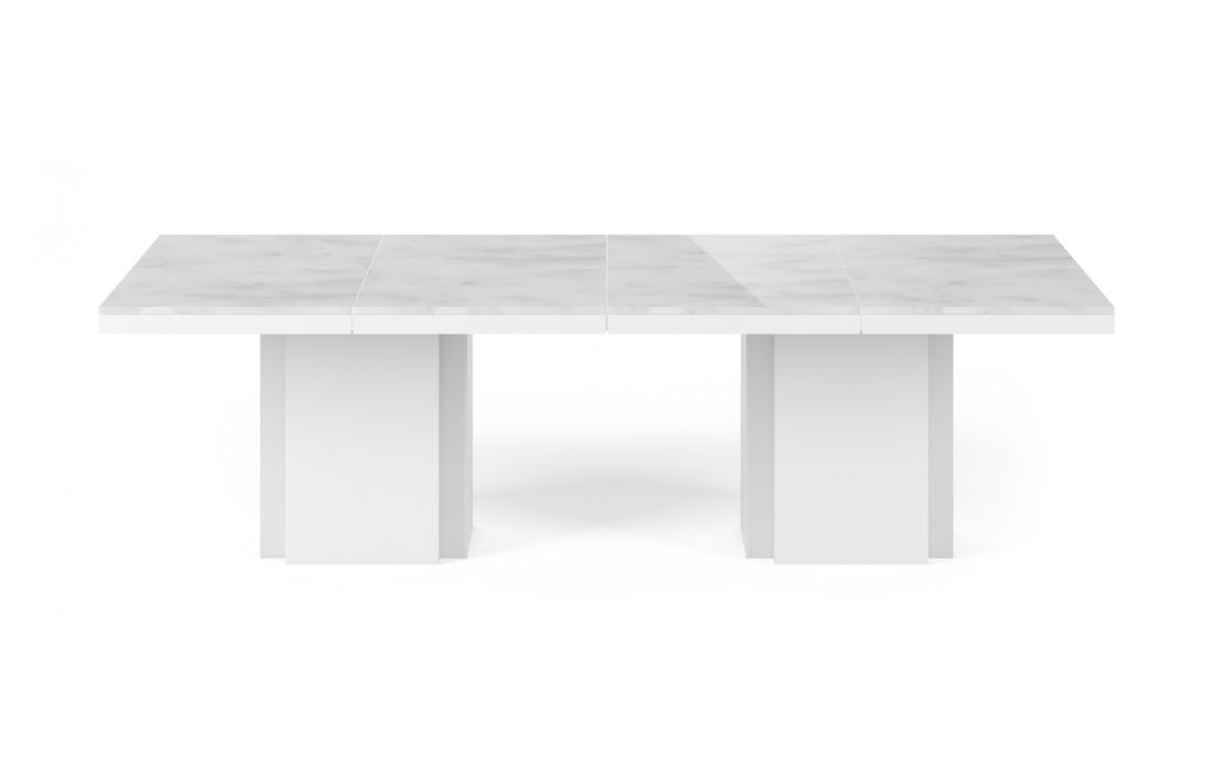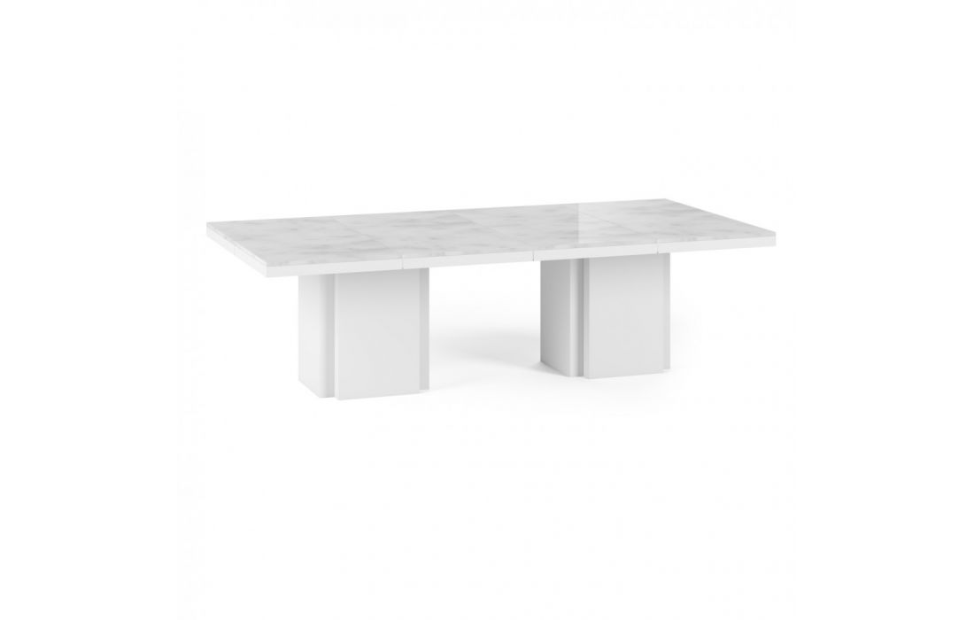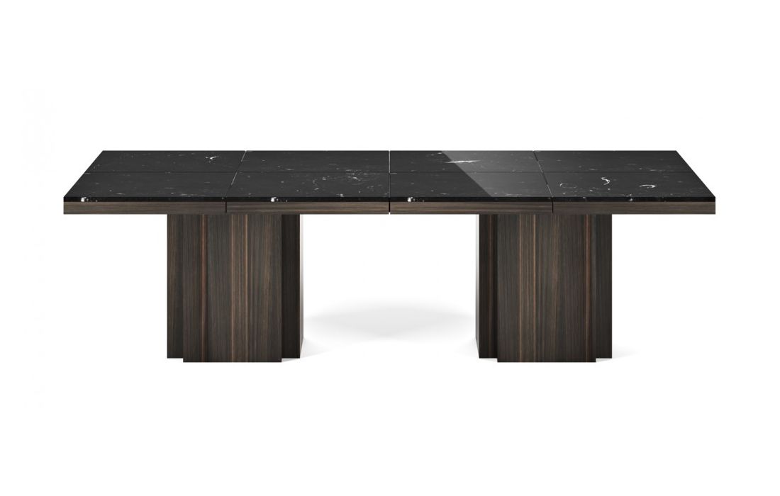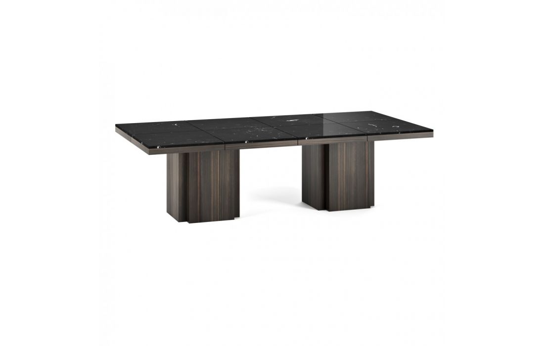 Geometric table, combines 8 square marble tops, joined by a discrete metallic profile, with 2 predominant central feet.