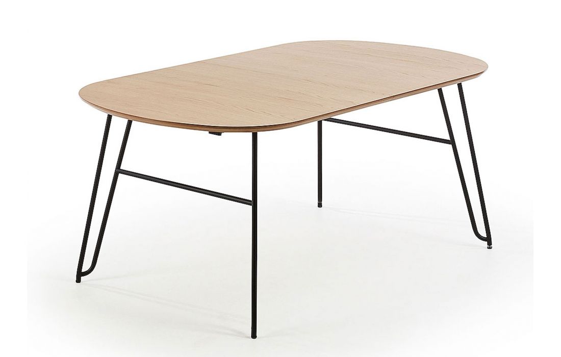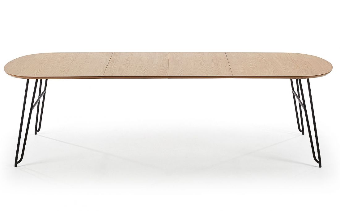 Extendable dining table with natural oak veneer and black metal trim.Available with two measures of 140 (220) with two extensions of 40 cm each or 170 (320) with three extensions of 50 cm each.