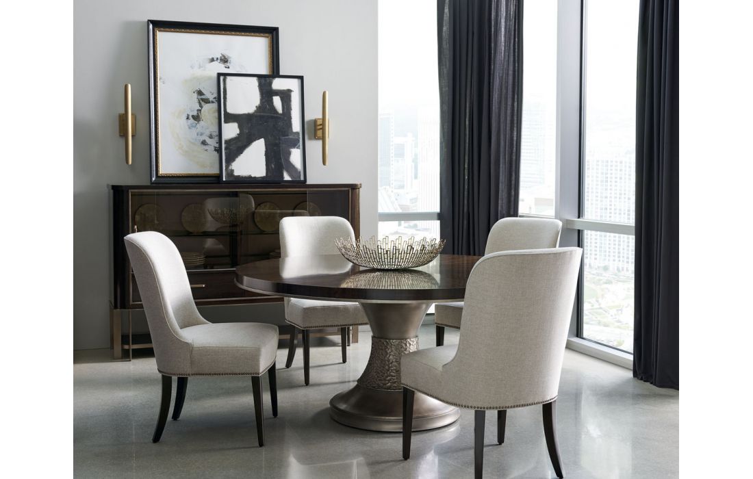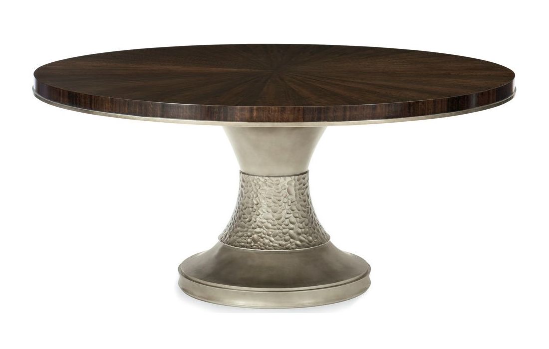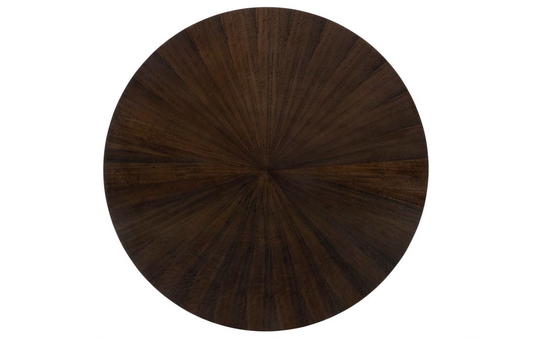 Dramatic sculptural details that merge into this round dining table with comfortable seating for up to 6 people. The pyrogenic eucalyptus takes on a warm glow with its aged "Bourbon" finish. The eucalyptus was embedded in a starburst pattern surrounded by a bronze casting band. We are soon attracted to the bronze base which is a work of art on its own