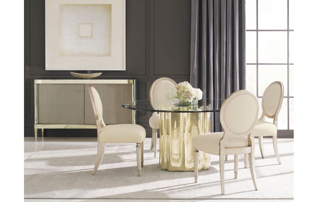 Contemporary inspiration in the dining room with this "Whisper of Gold" metal pedestal that shines under the round glass table. A reflective beauty, the pedestal is an impressive piece of art trimmed in itself. This piece is perfect for dinner for two, four or six