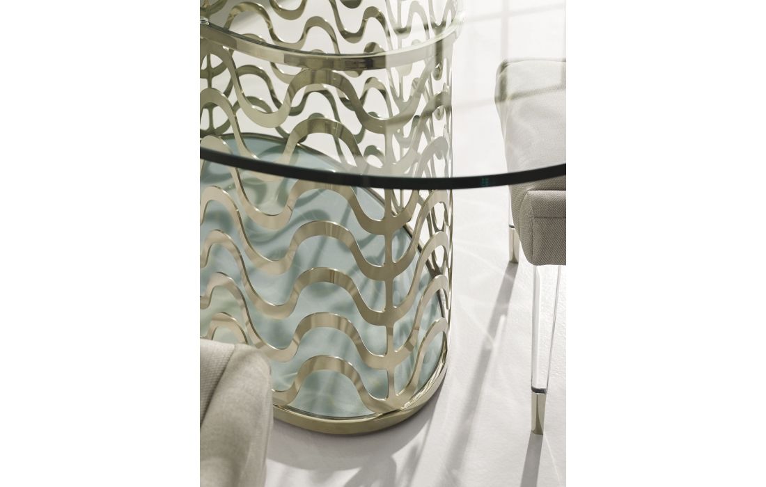 Look closely at the contemporary view of the nature of the table with is "Whisper of Gold" metal waves that produce an undulating transparent base that suspends a clear oval glass table top. Peek through the top to the bottom and watch the color of the ocean float over the glass at the base. With its wavy appeal, this table deserves to be the centerpiece of the room