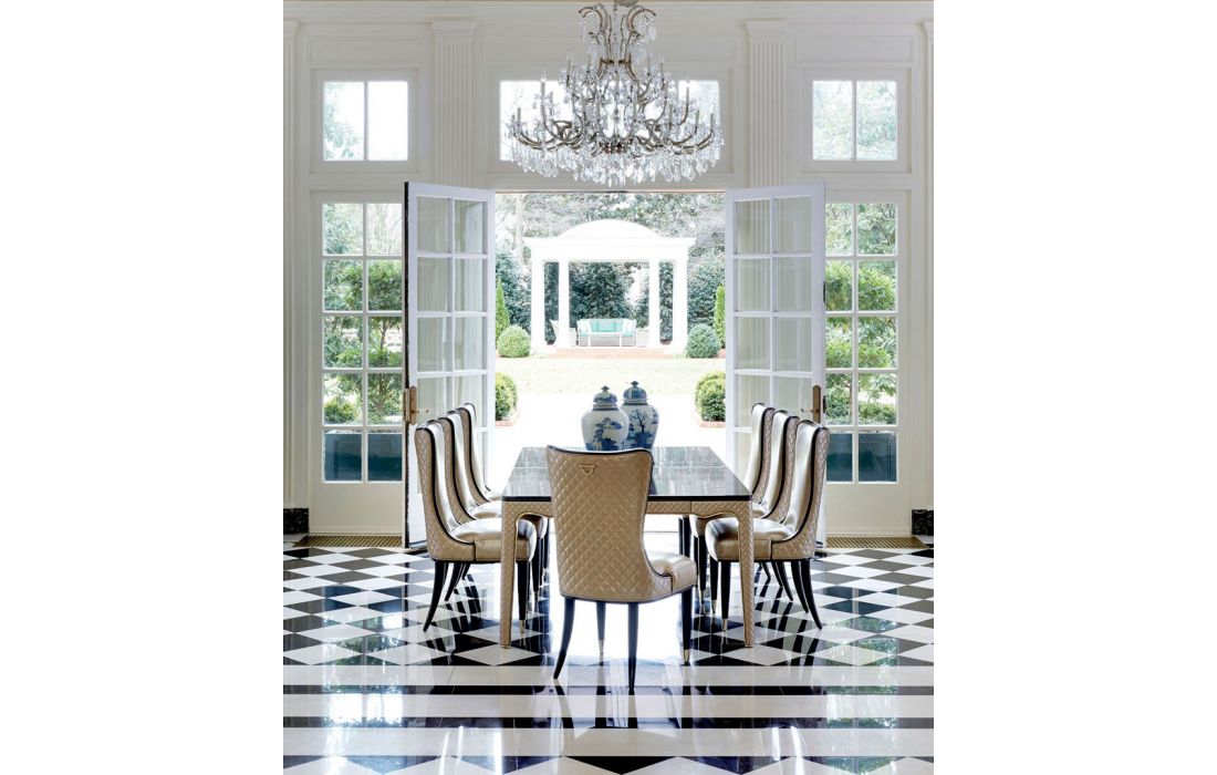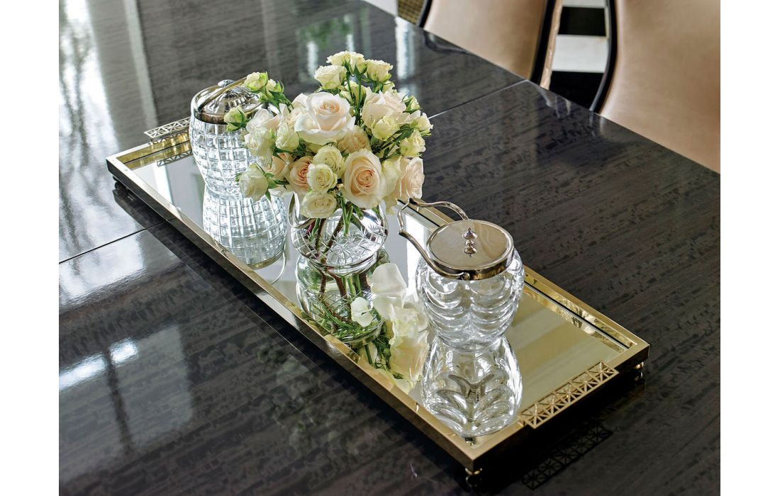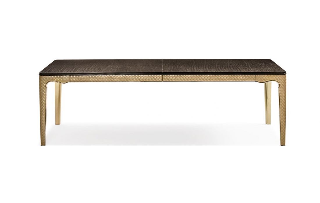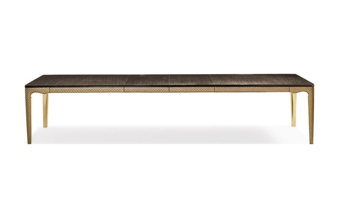 Extendable dining table with wood top and details in gold and genuine leather
