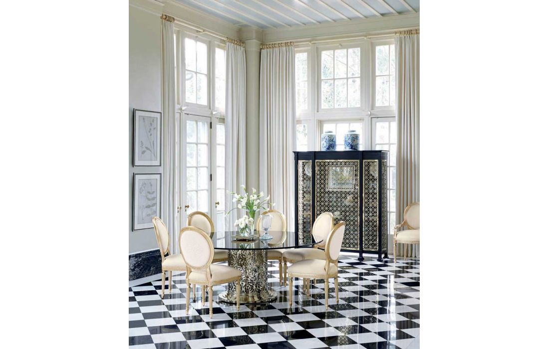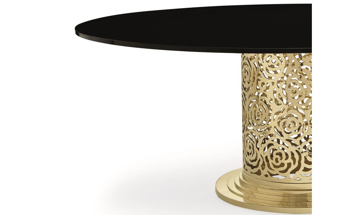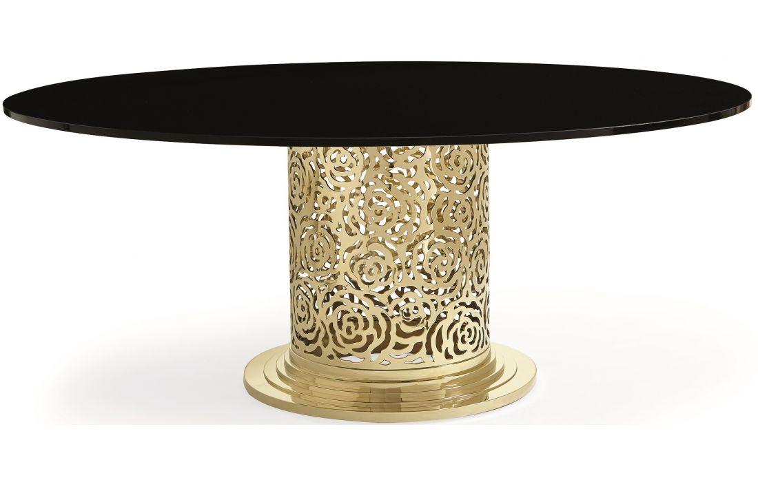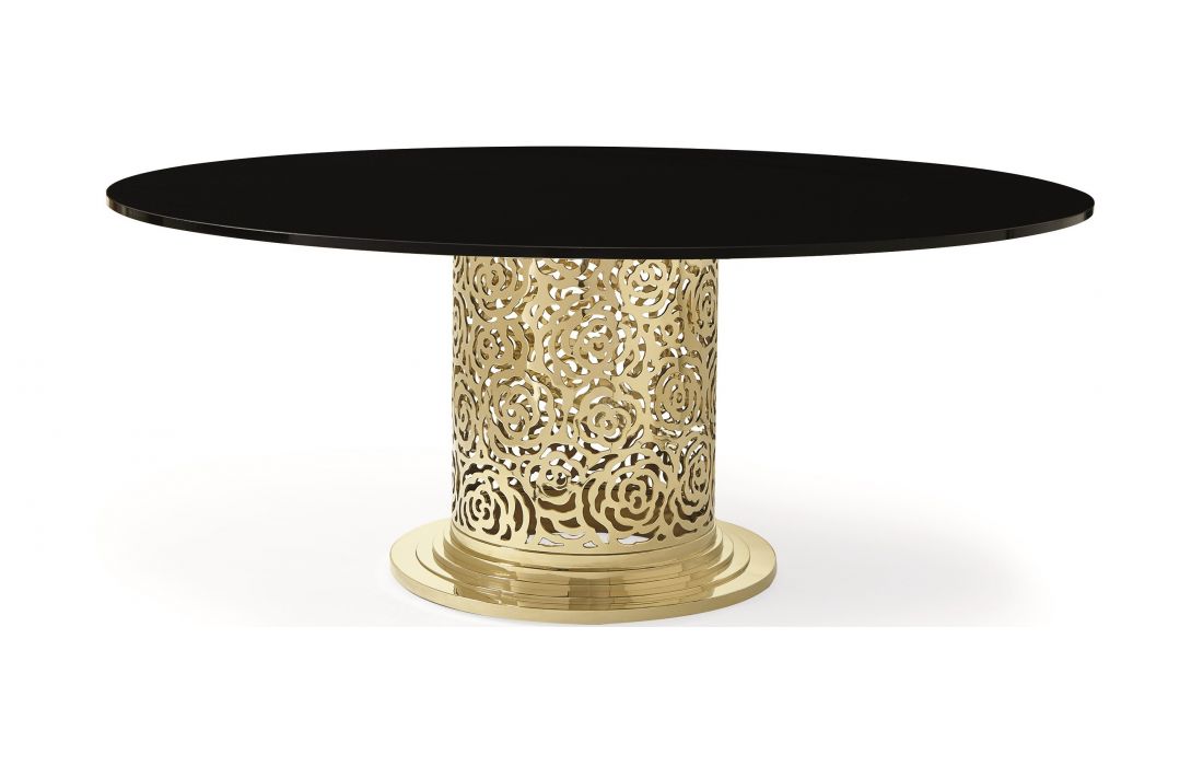 This black beauty is a statement in glamour. A work of contemporary art, its base is a highly polished Majestic Gold filigree of intertwined roses and with a black glass top. This table is a sophisticated gem for your collectionand and will be the gorgeous centerpiece of memorable conversations