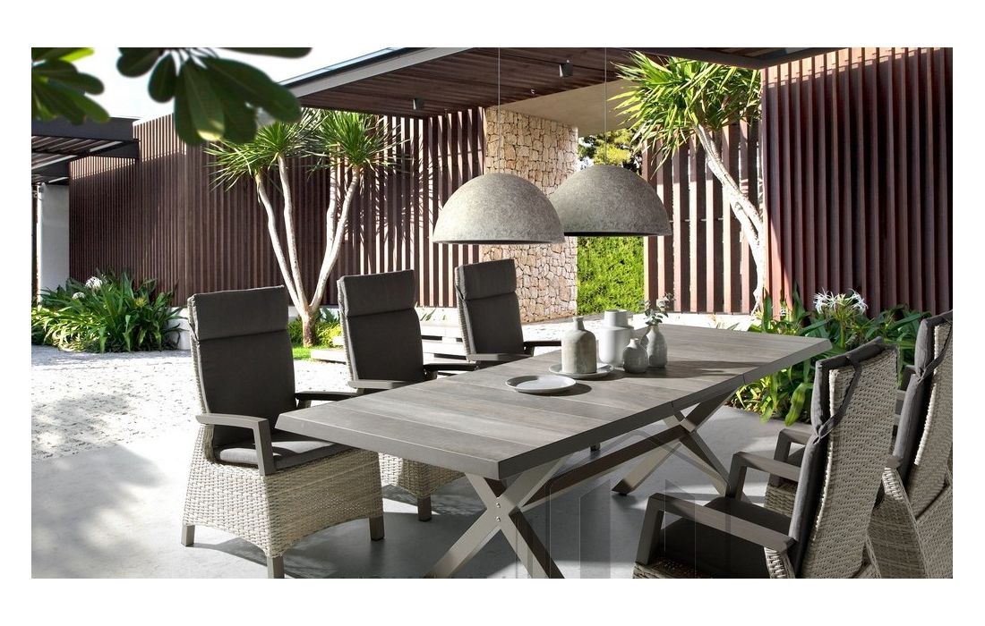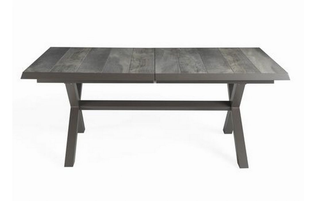 Rectangular aluminum table with ceramic top, for outdoor use.