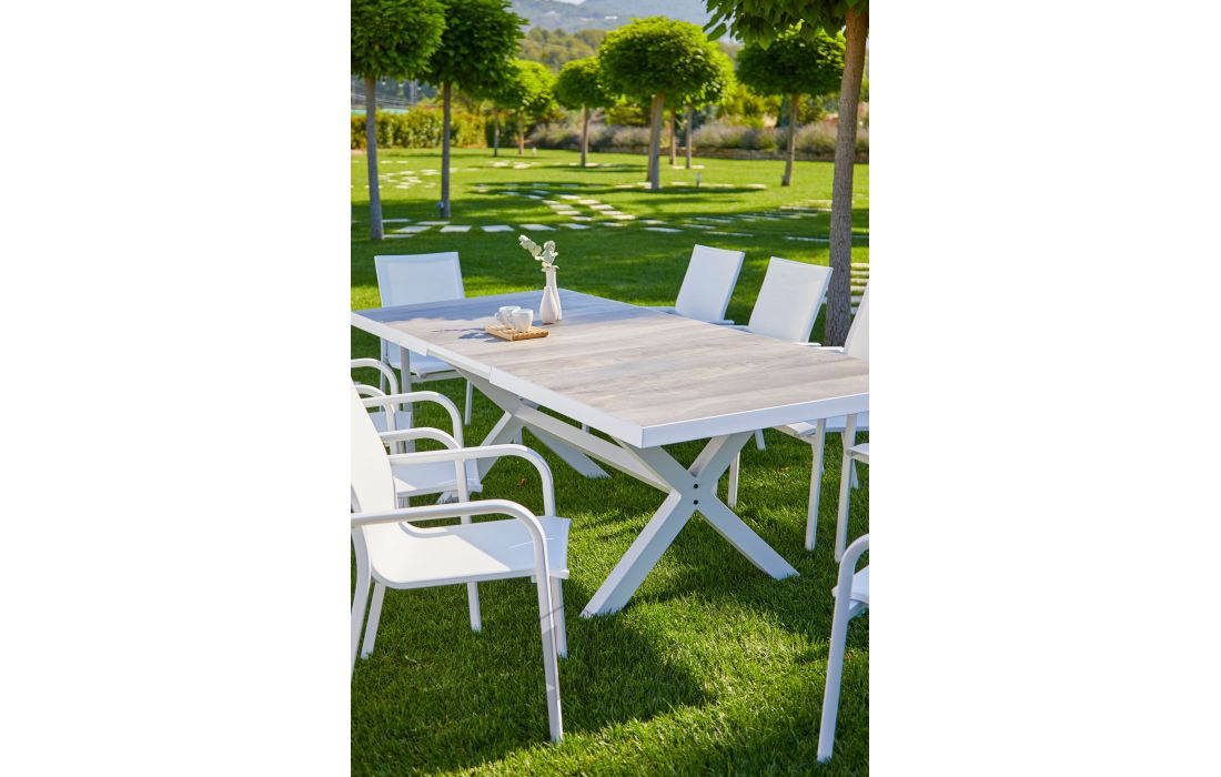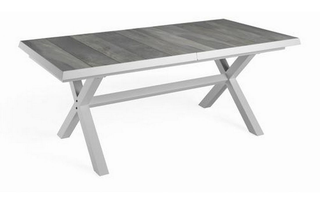 Rectangular aluminum table with ceramic top, for outdoor use.
