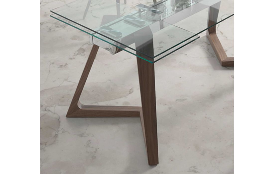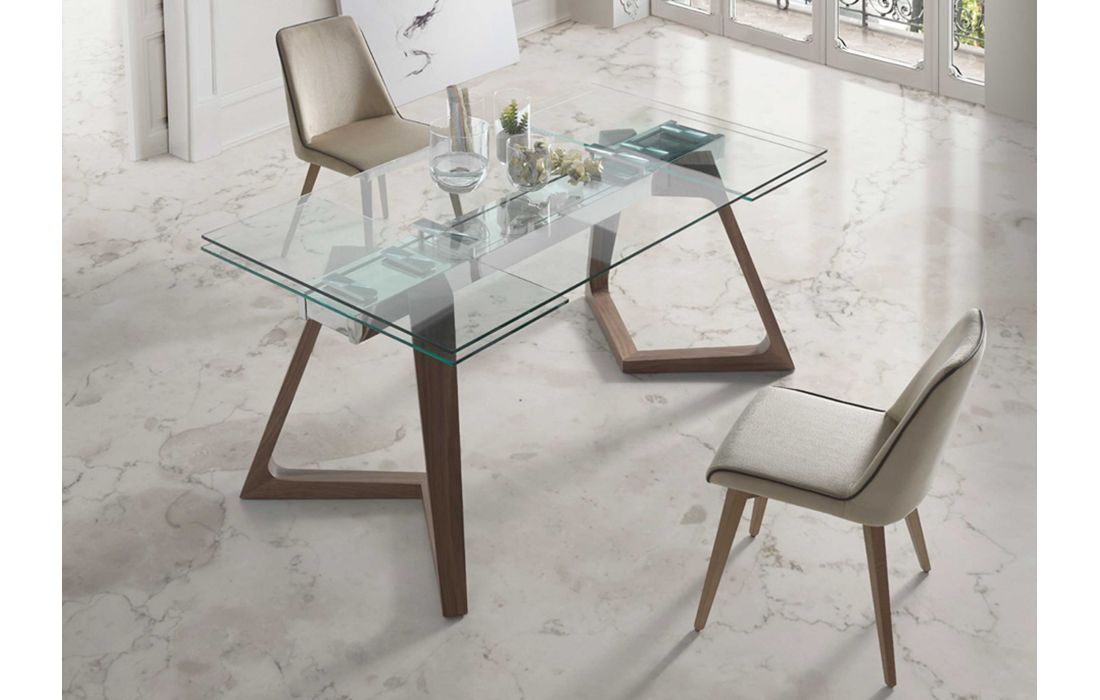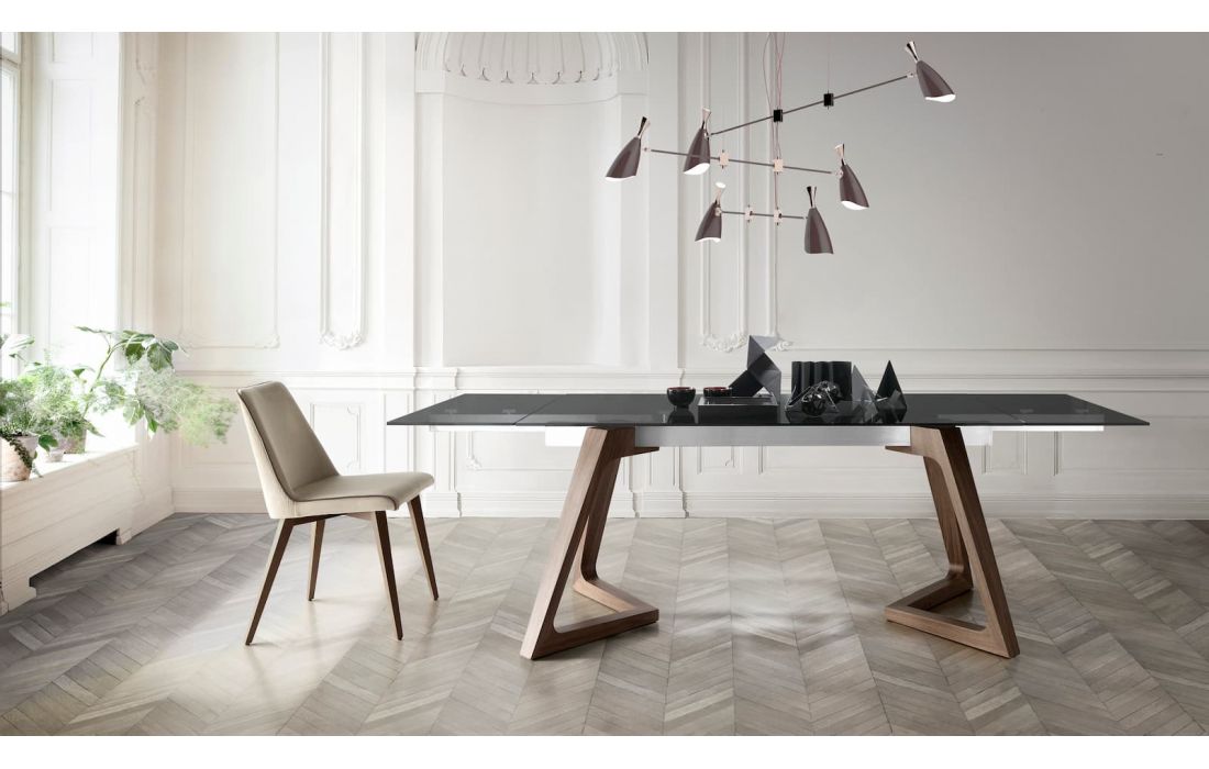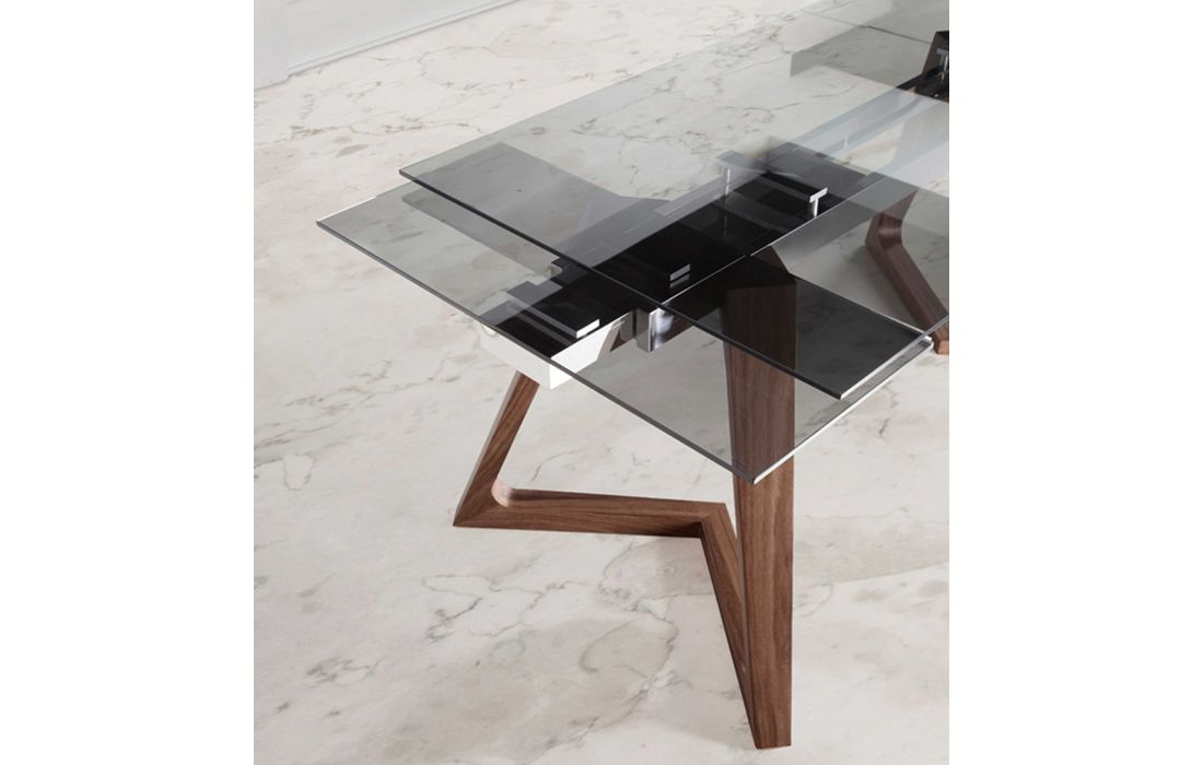 Extensible rectangular table, in 2 sizes, with 12mm transparent or gray glass top and possibility of legs in wood or lacquered finish