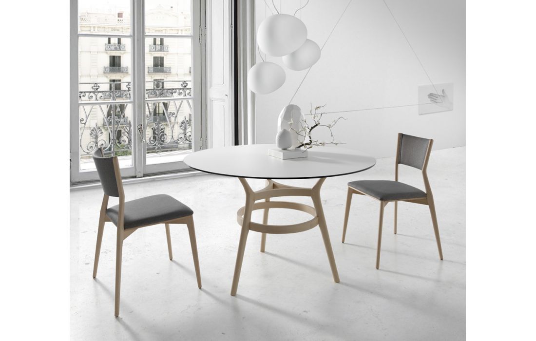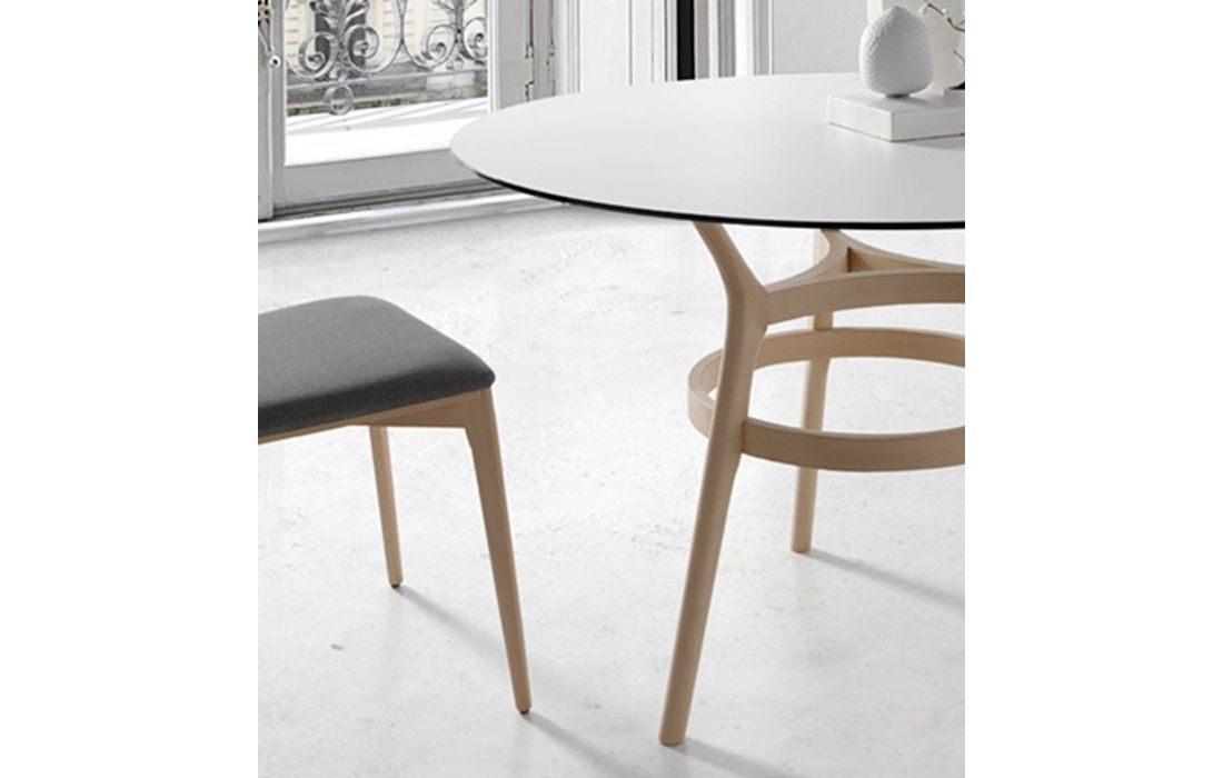 Round table, in 2 sizes, with 12mm glass or 12mm marble top and the possibility of legs in wood or lacquered finish
