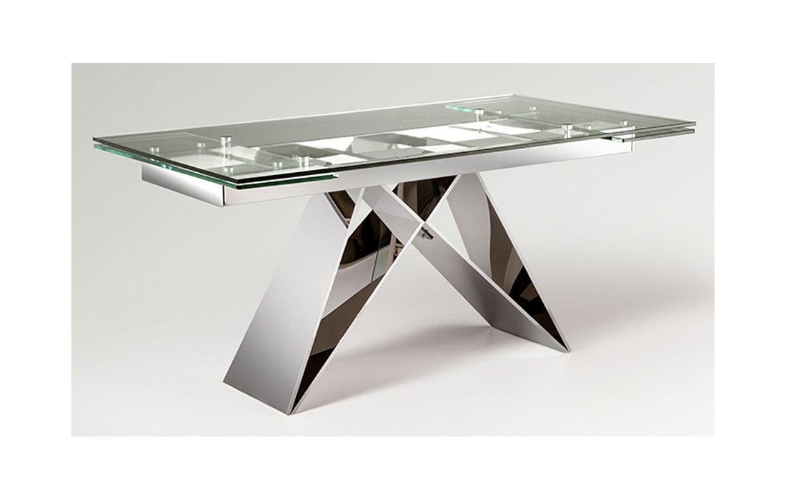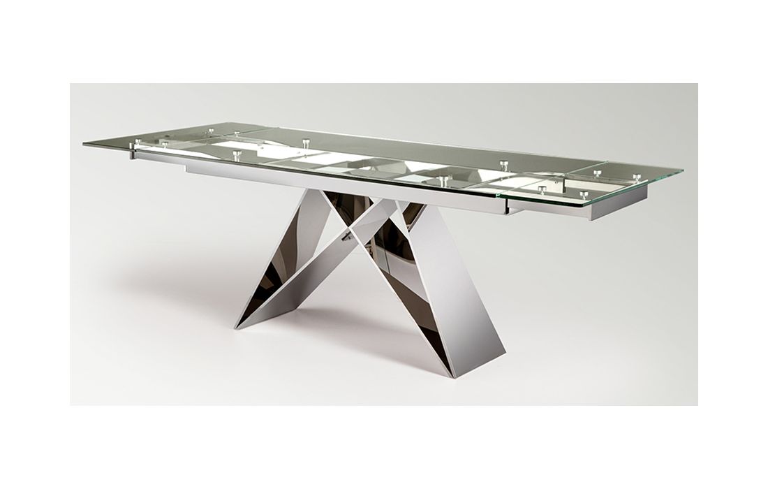 Extendable dining table with stainless steel structure in high gloss finish and 12 mm glass top with polished corners.