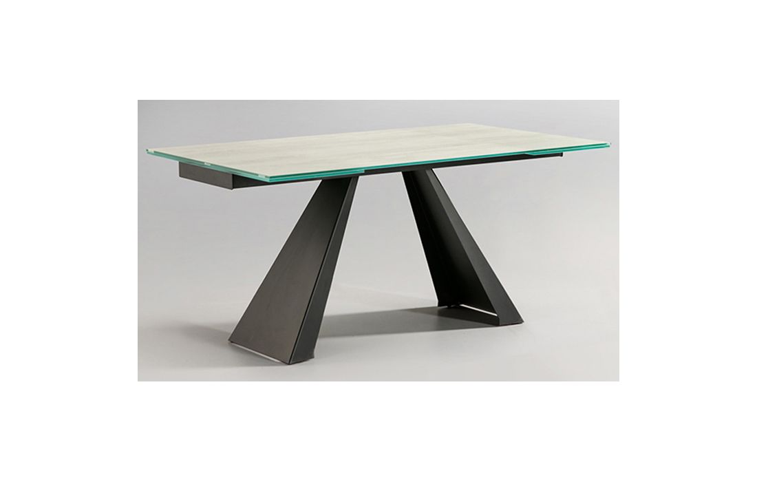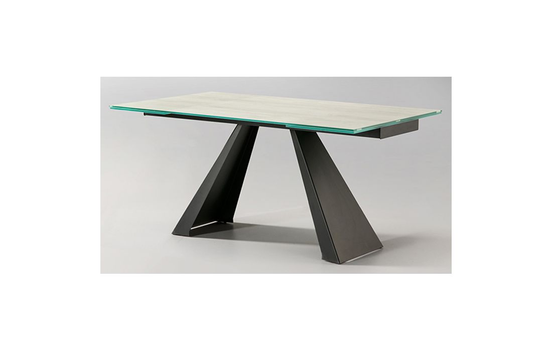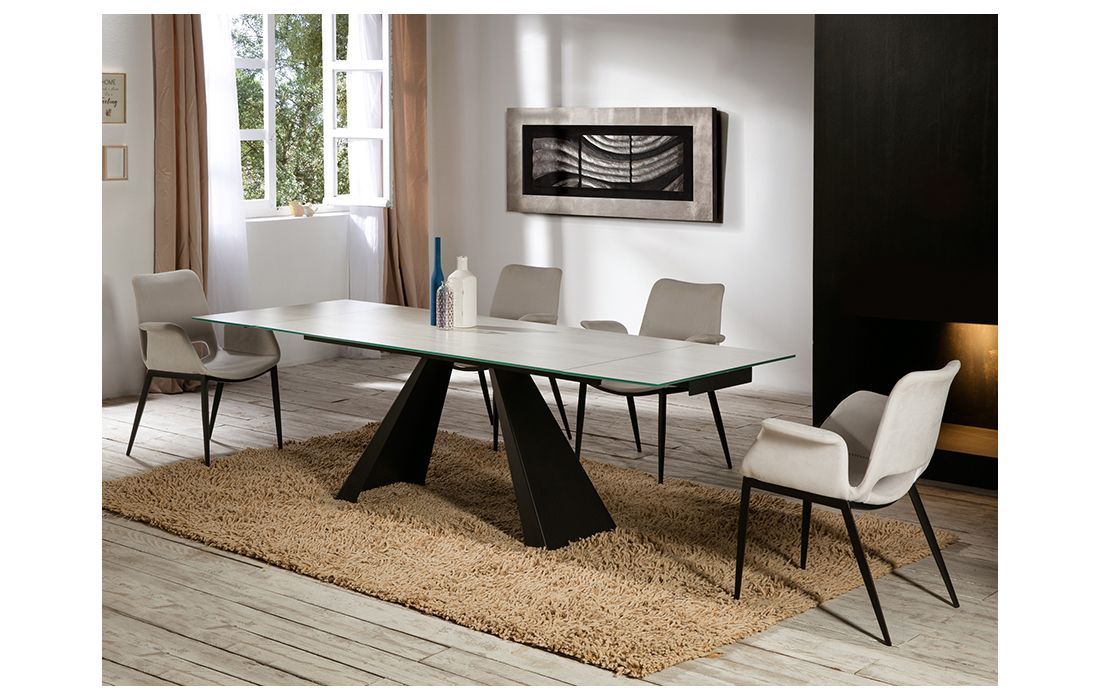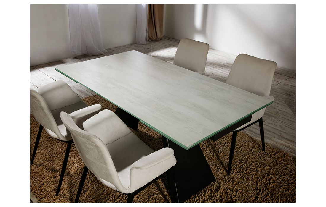 Extensible dining table with metal frame with matt black finish and 10 mm tempered glass top, printed with white texture with veins and high resistance finish. Two 40 cm extendable boards.