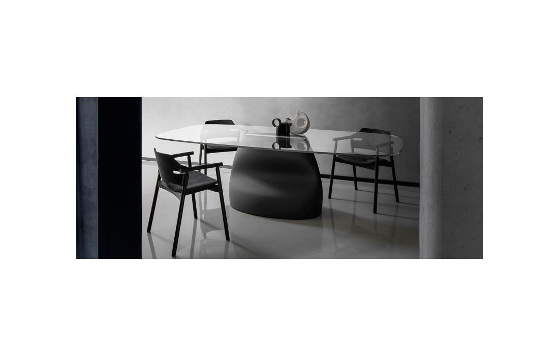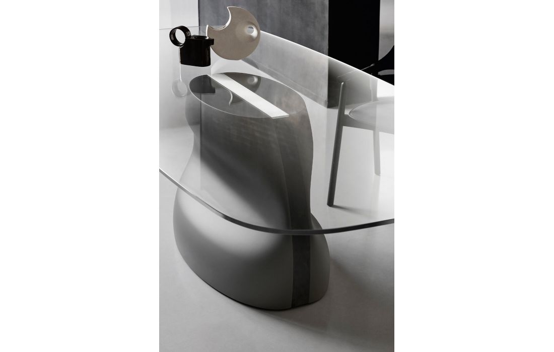 Table with glass top and base in polyurethane Baydur, available in various structure colors and finishes.Recipient :
