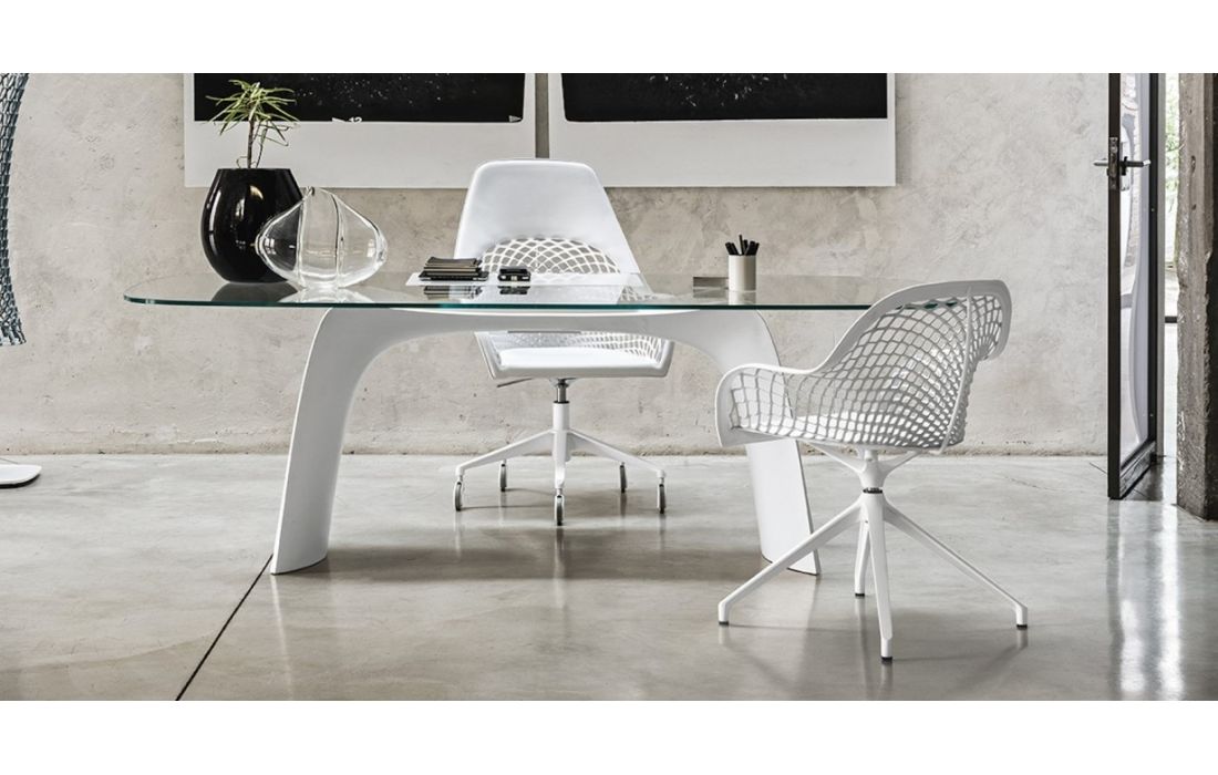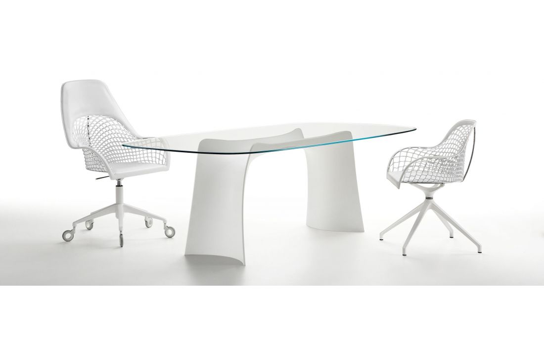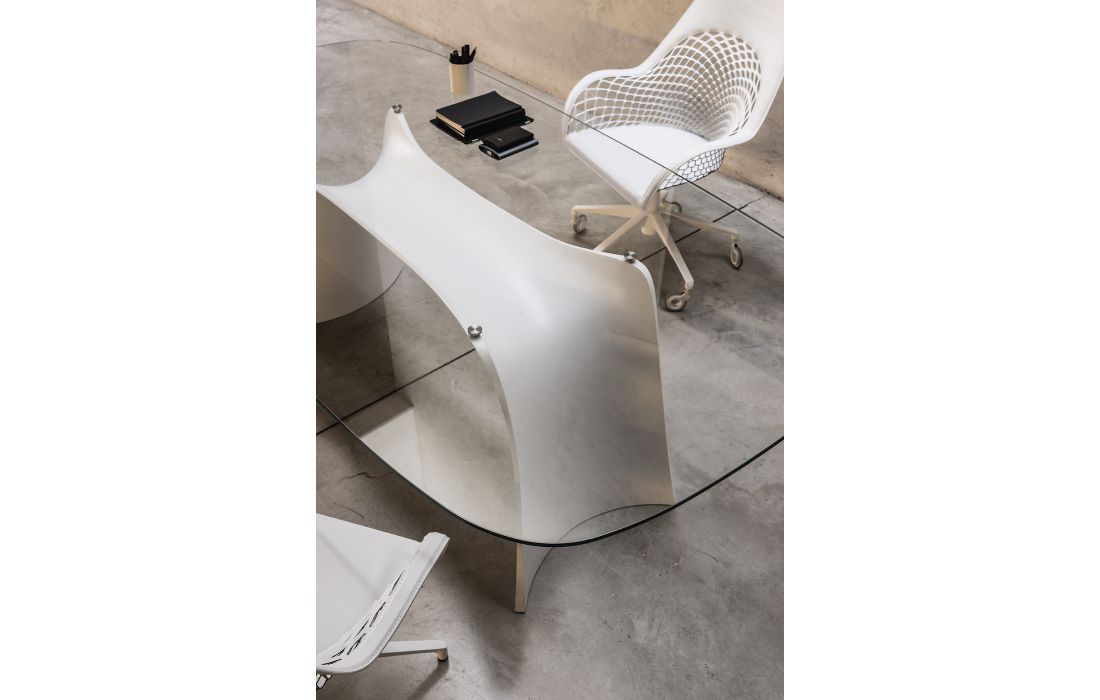 Table with EXTRA CLEAR TRANSPARENT J01 glass top and Baydur polyurethane base, available in two frame colors.Recipient :