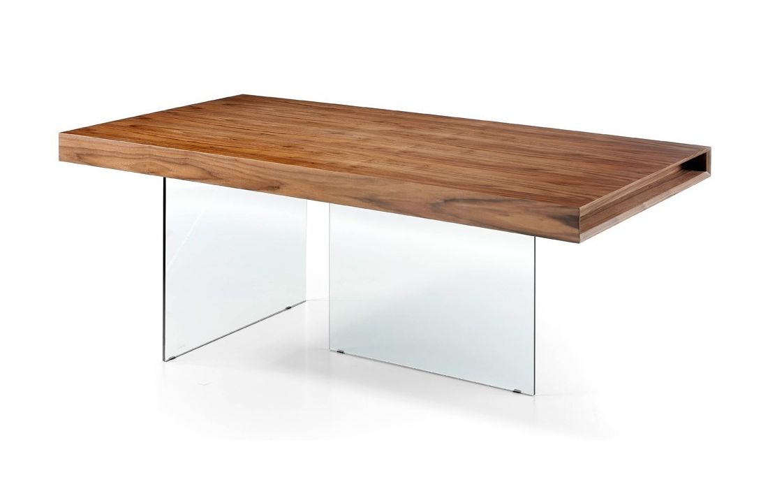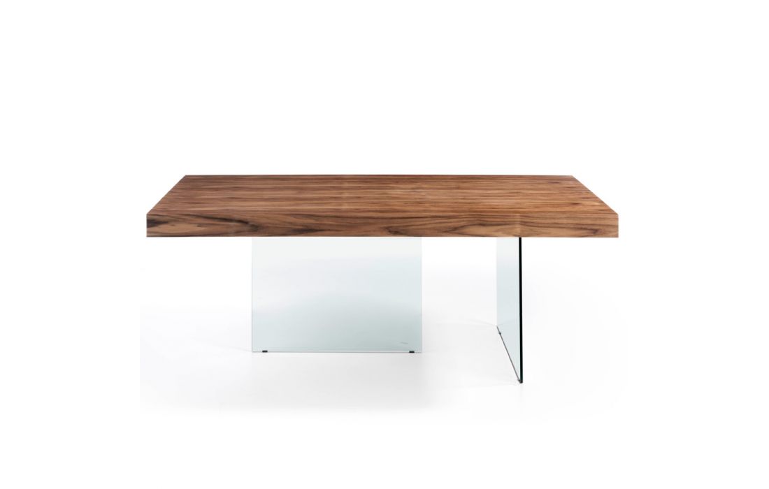 Rectangular dining table with walnut-veneered wood top and tempered glass legs.