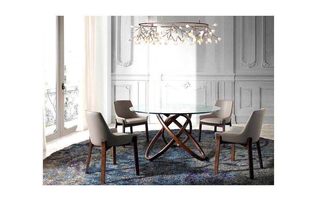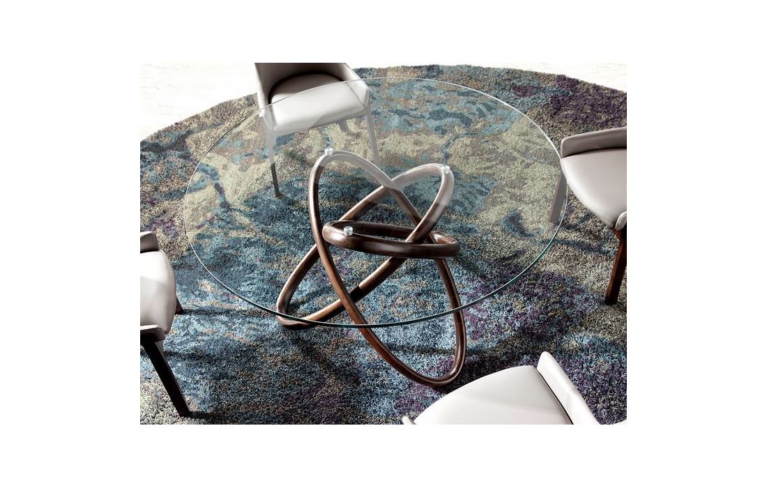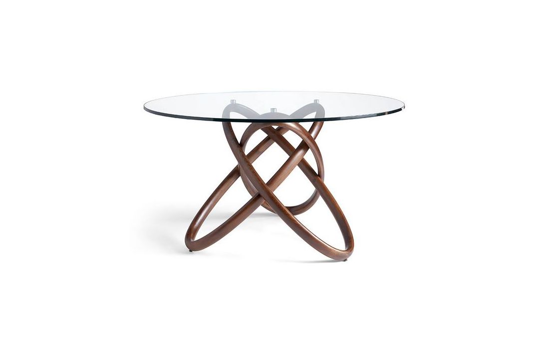 Round table with structure in solid walnut wood with tempered glass top.
