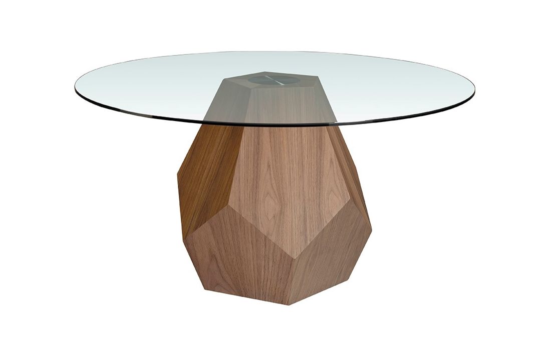 Round dining table in tempered glass and walnut-colored pine wood.