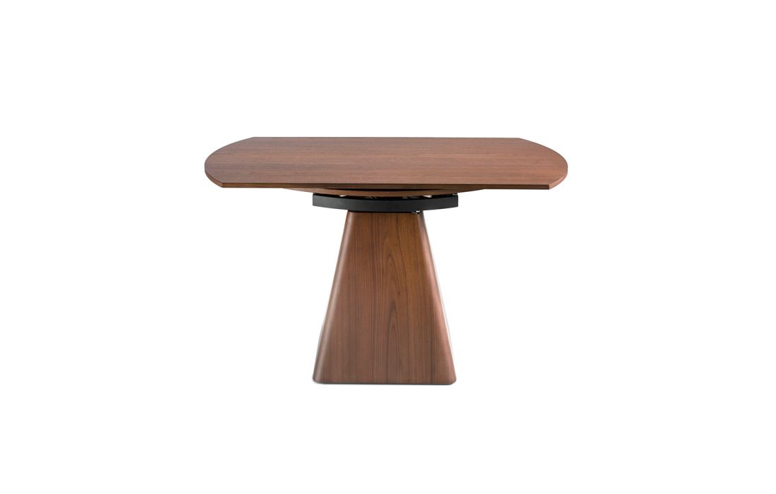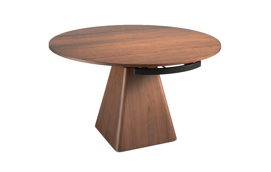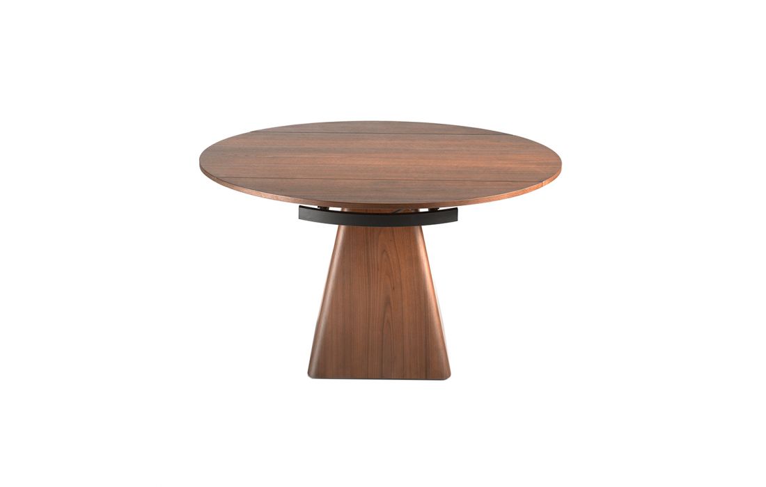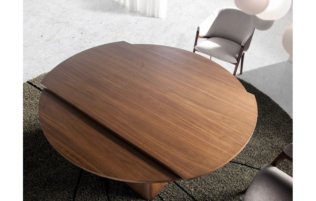 Extendable round dining table with automatic rotating opening in ash wood and walnut wood and square pyramid-shaped baseDimensions in cm