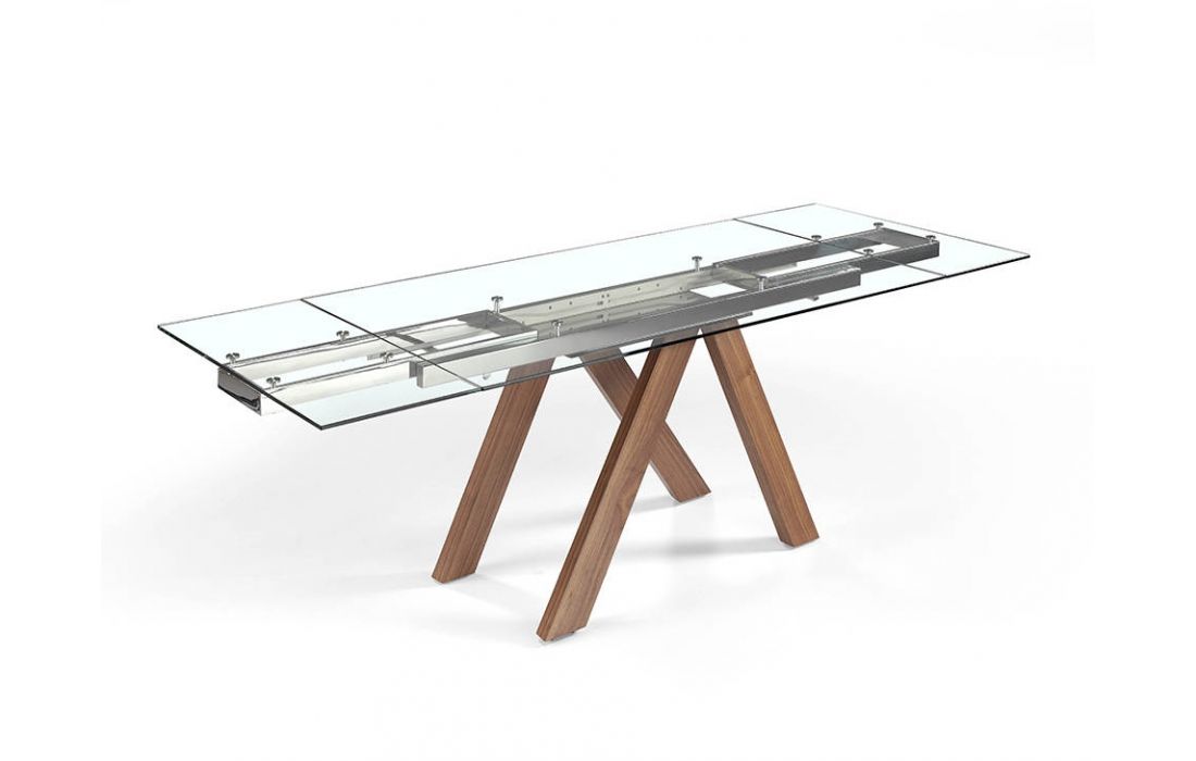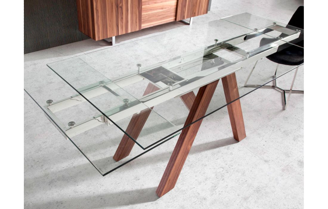 Mesa de jantar extensível retangular com tampo em vidro temperado transparente e pés em madeira folheada a nogueira.