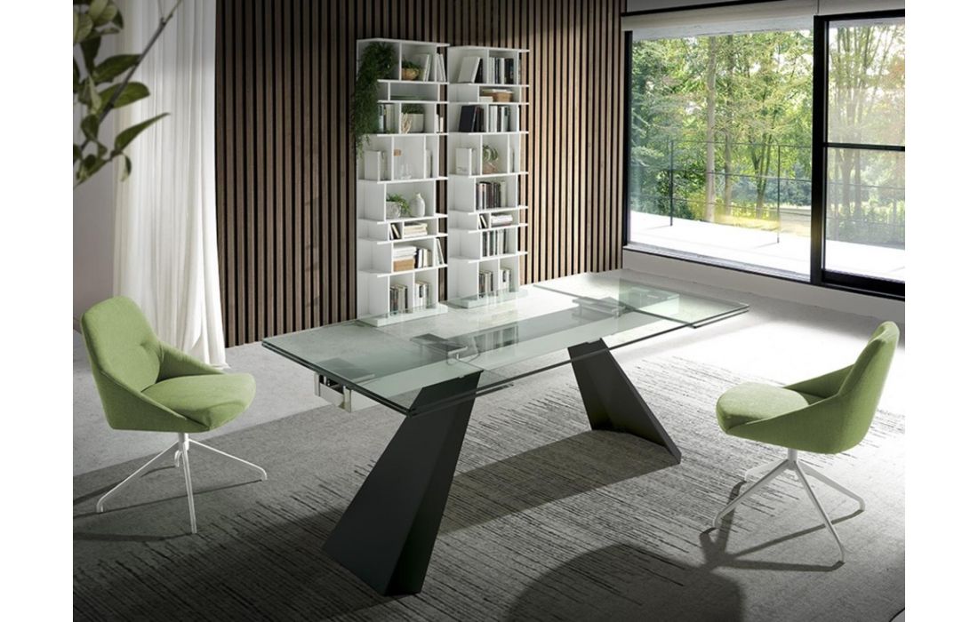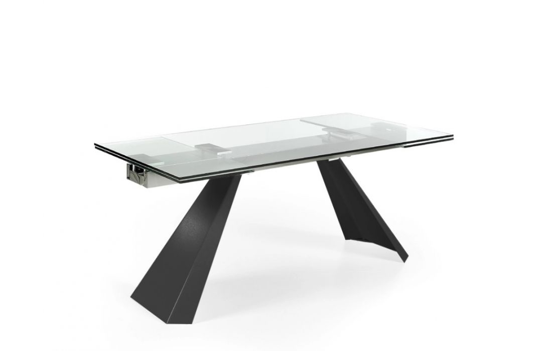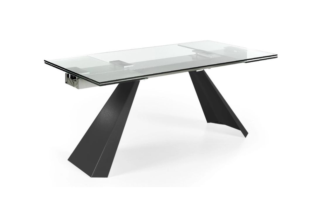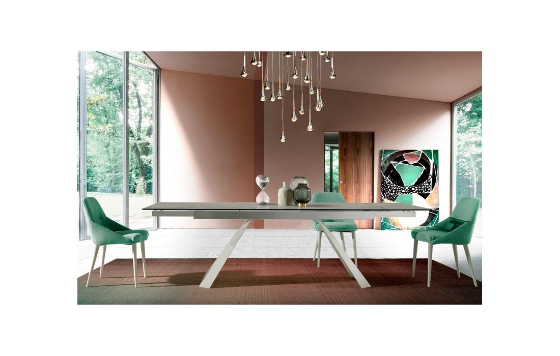 Extendable dining table with ceramic or glass top and metal legs